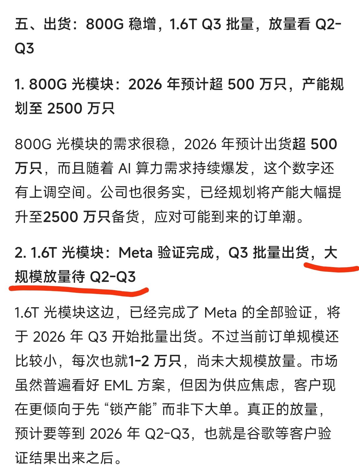 5、东山1.6T光模块这边,已经完成了Meta的全部验证,将于2026年Q3开始批量出货。