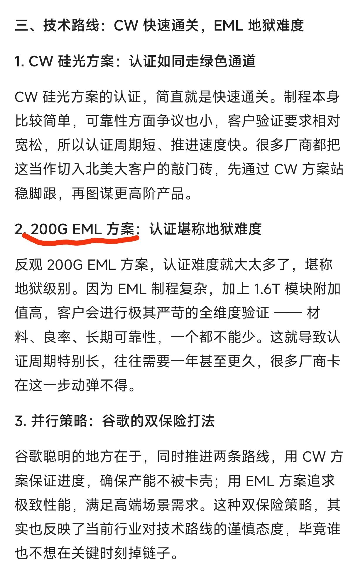 4、CW硅光方案认证较快,200G EML方案认证堪称地狱难度,说明EML难度更高,能量产并出货的只有Lumentum、Coherent、日本 住友、索尔思4家,长光华芯和光迅目前是小批量,源杰和华工还处于送样验证。