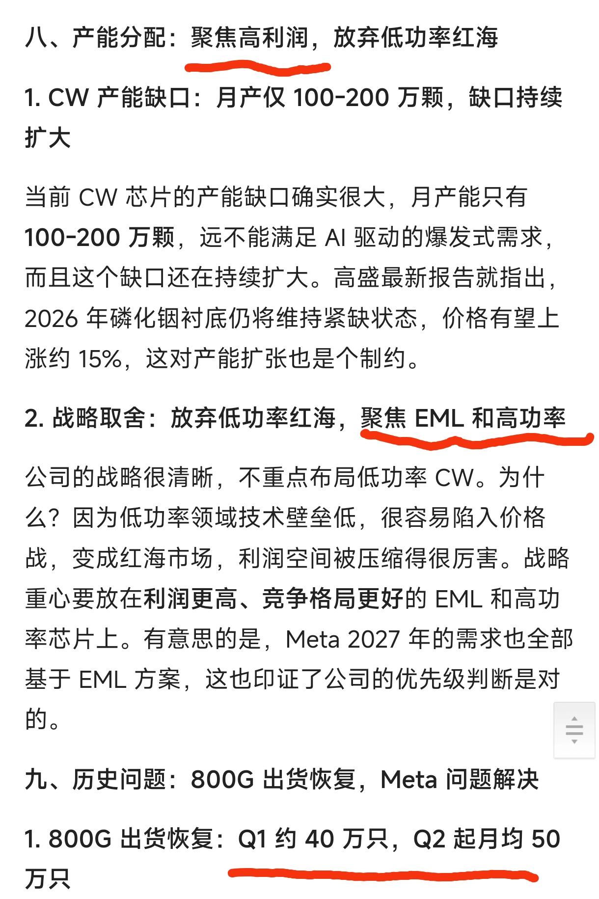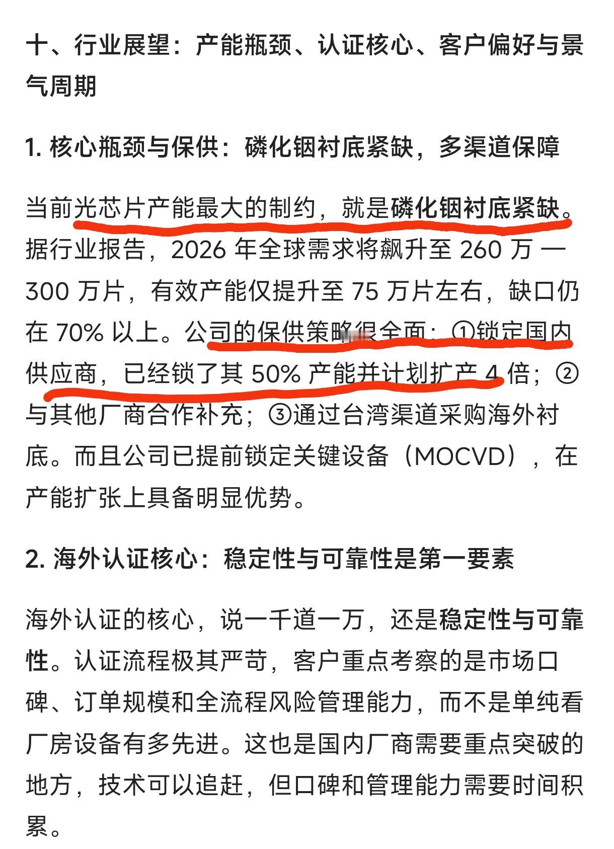 6、现在光芯片产能最大的制约,就是磷化铟衬底紧缺。东山保供策略是锁定国内供应商,已经锁了其50%产能并计划扩产4倍,另外通过台湾渠道采购海外衬底。