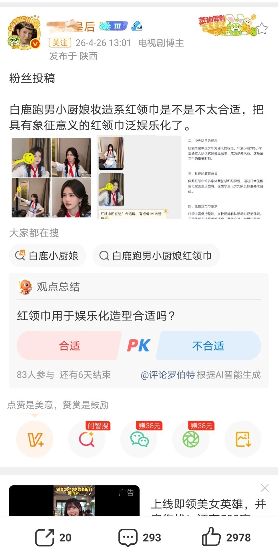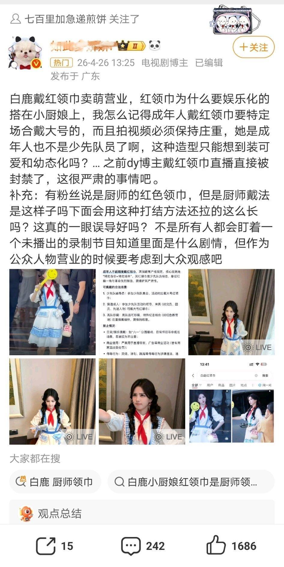 看了把白鹿带厨师领巾带节奏说是红领巾的几个yxh,都是老面孔,我发现内娱女明星真的就白鹿有黑yxh矩阵,真的挺多的还抱团,这个是厨师级别领巾,跑男团成员都有带,只是白鹿的是红色,而且我记得小时候带红领巾也是一边超级短一边很长,厨师领巾是差不多长,也是白鹿没什么黑点血厚又吸粉,不然真的就天天被这些黑yxh恶意尬黑,没几个扛得住!白鹿 厨师领巾