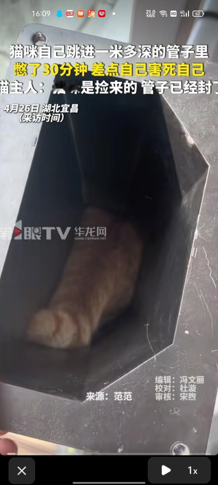 4月25日,湖北宜昌。女子发视频称,大概早上八点,猫咪跳进一米多深的管子里出不来了,员工开门发现没看到猫。找的时候听到管子里发出声音,就发现它了,它在里面待了三十分钟。这只猫是今年三月初捡回来的,捡回来之后还做了绝育手术。
