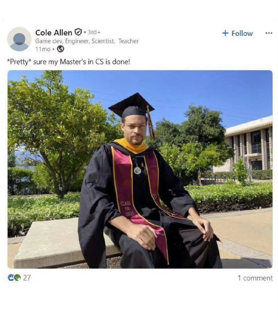 2017年毕业于加州理工学院,获机械工程学士学位;2025年获加州州立大学多明格斯山分校计算机科学硕士学位。