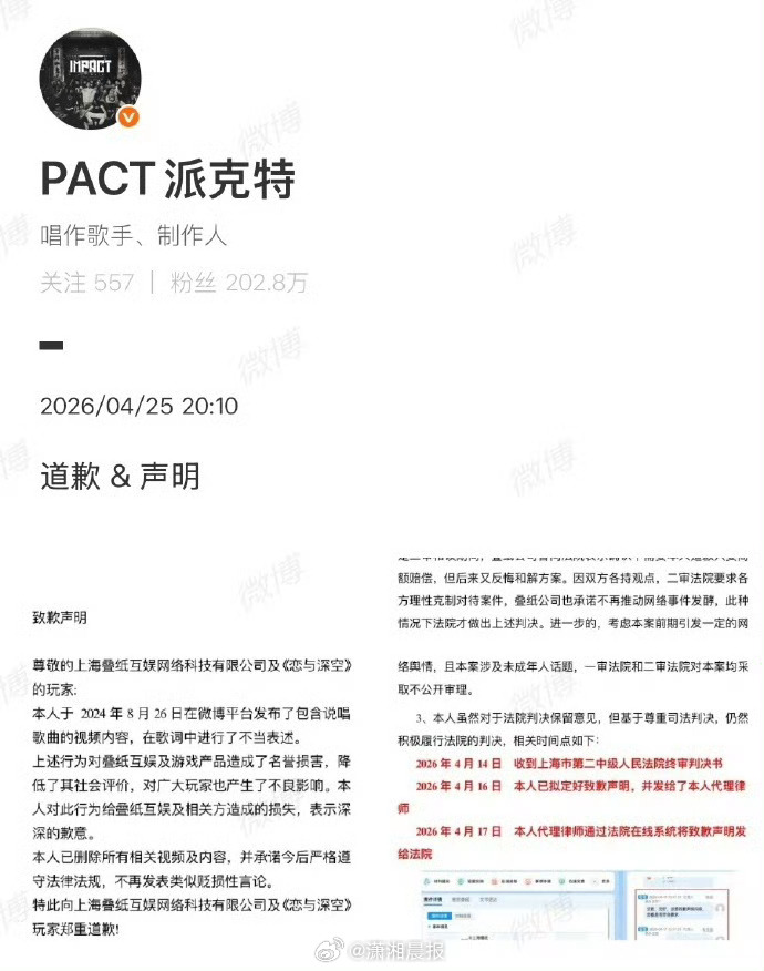 25日晚,派克特发布致歉声明;本人于2024年8月26日在微博平台发布了包含说唱歌曲的视频内容,在歌词中进行了不当表述。上述行为对叠纸互娱及游戏产品造成了名誉损害,降低了其社会评价,对广大玩家也产生了不良影响。本人对此行为给叠纸互娱及相关方造成的损失,表示深深的歉意。本人已删除所有相关视频及内容,并承诺今后严格遵守法律法规,不再发表类似贬损性言论。特此向上海叠纸互娱网络科技有限公司及《恋与深空》玩家郑重道歉!