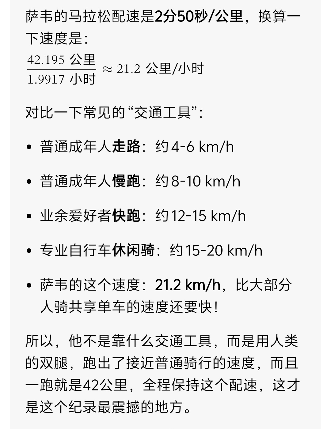 人类马拉松破二 搜了下,平均配速大约是 2分50秒/公里,意味着他每公里用时不到3分钟太猛了吧