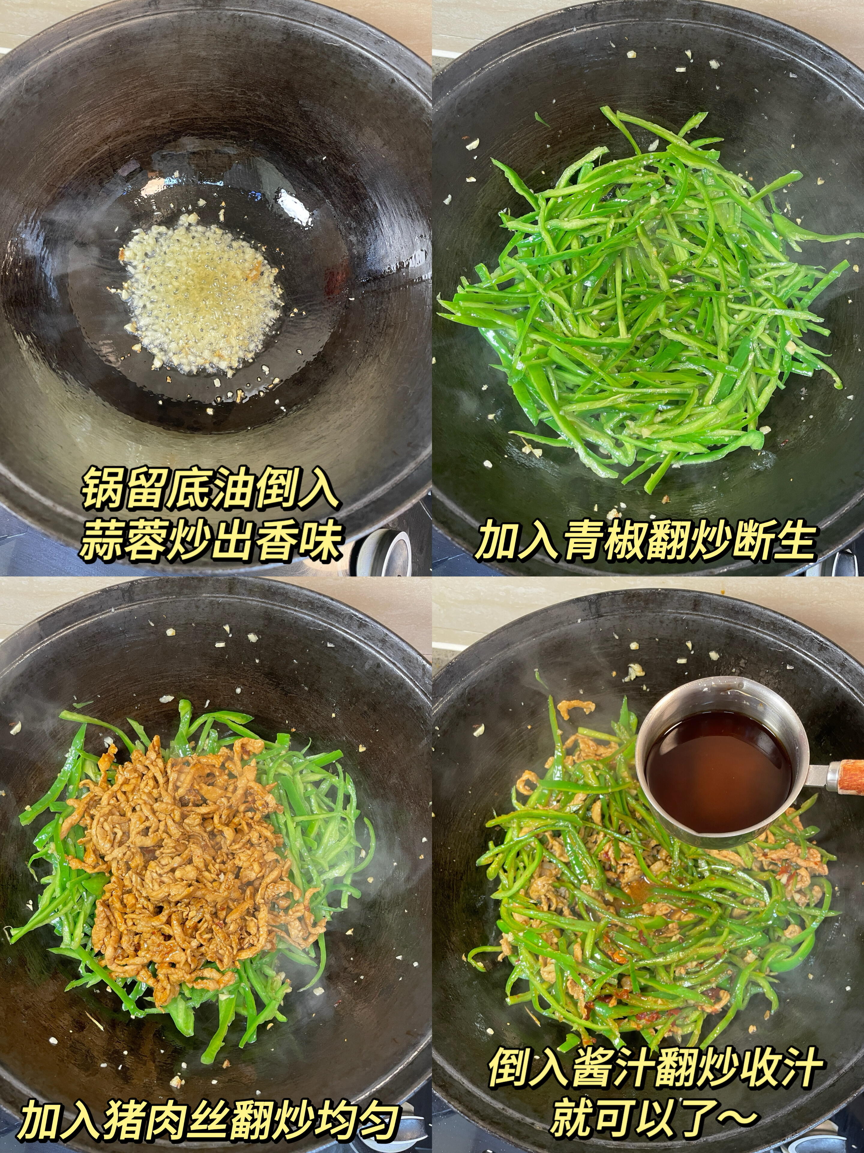 5. 淋入提前调好的酱汁,开大火快速翻炒,边翻炒边收汁,待酱汁变得浓稠,紧紧裹在肉丝和青椒上,即可关火出锅。