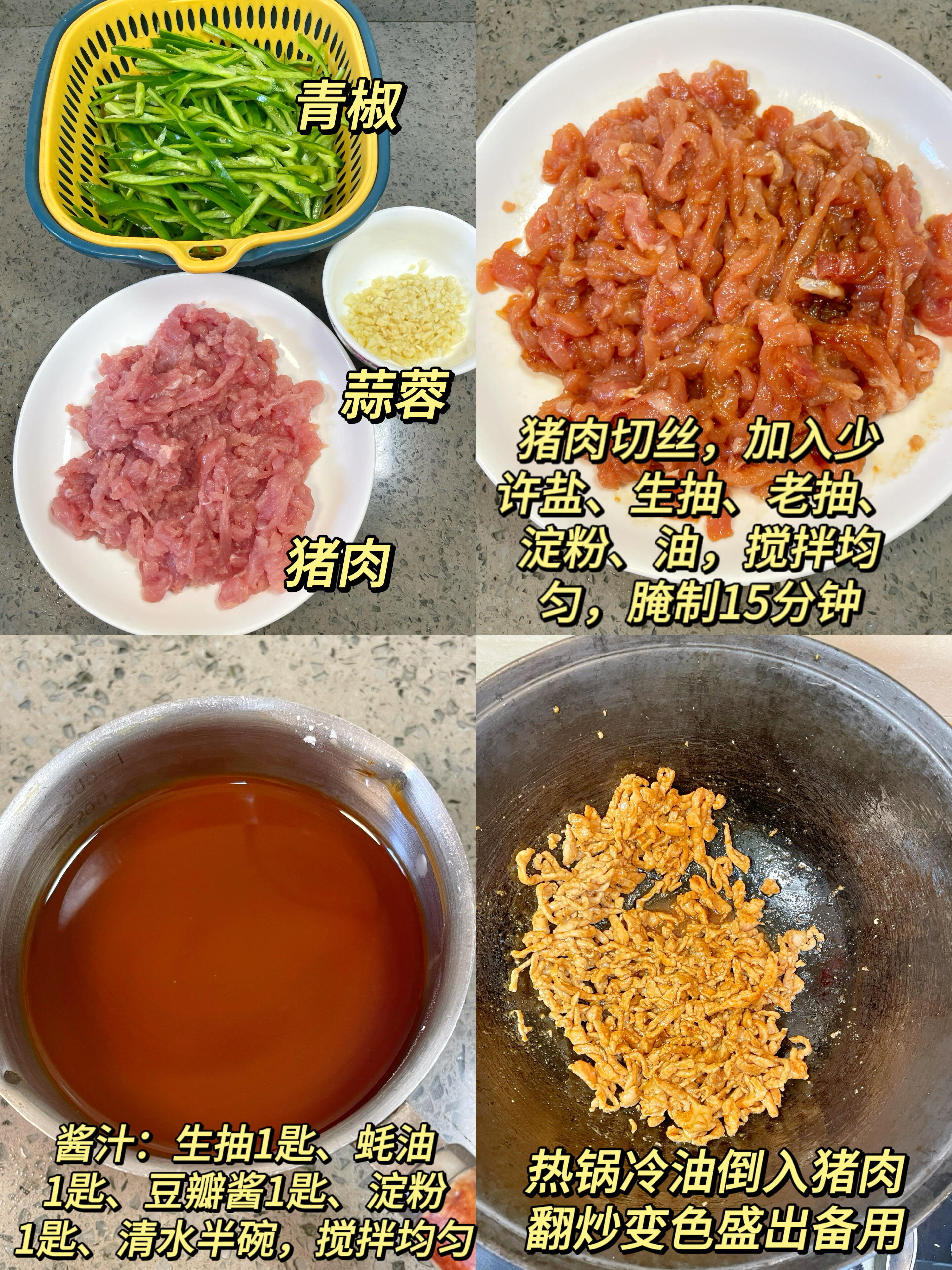 1. 猪肉洗净切成均匀的细丝,放入少许盐、适量生抽、少许老抽、一勺淀粉和少许食用油,用手充分抓匀,腌制15分钟,这样腌出来的肉丝滑嫩不柴,还能锁住水分。