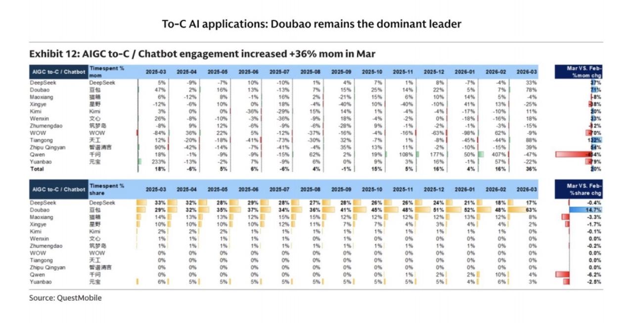 DAU、用户总时长,豆包都是绝对领先,用户时长渗透率,3月份豆包是63%,一家独大。