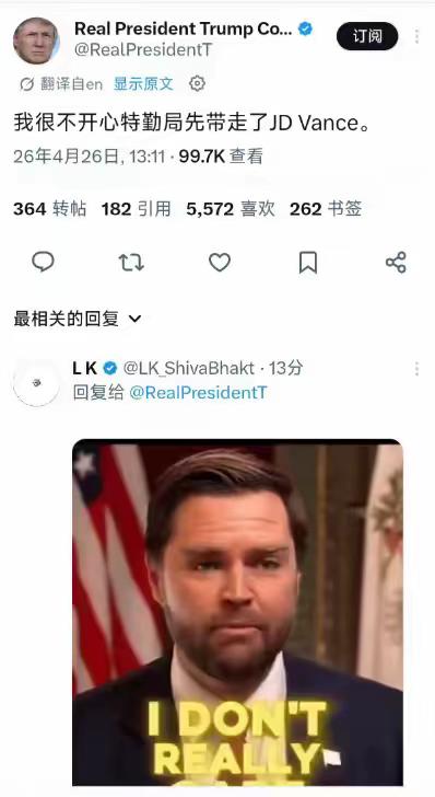 特朗普发文:我很不开心,特情局(居然)先带走了万斯。 这事特朗普没啥好哀怨滴,特