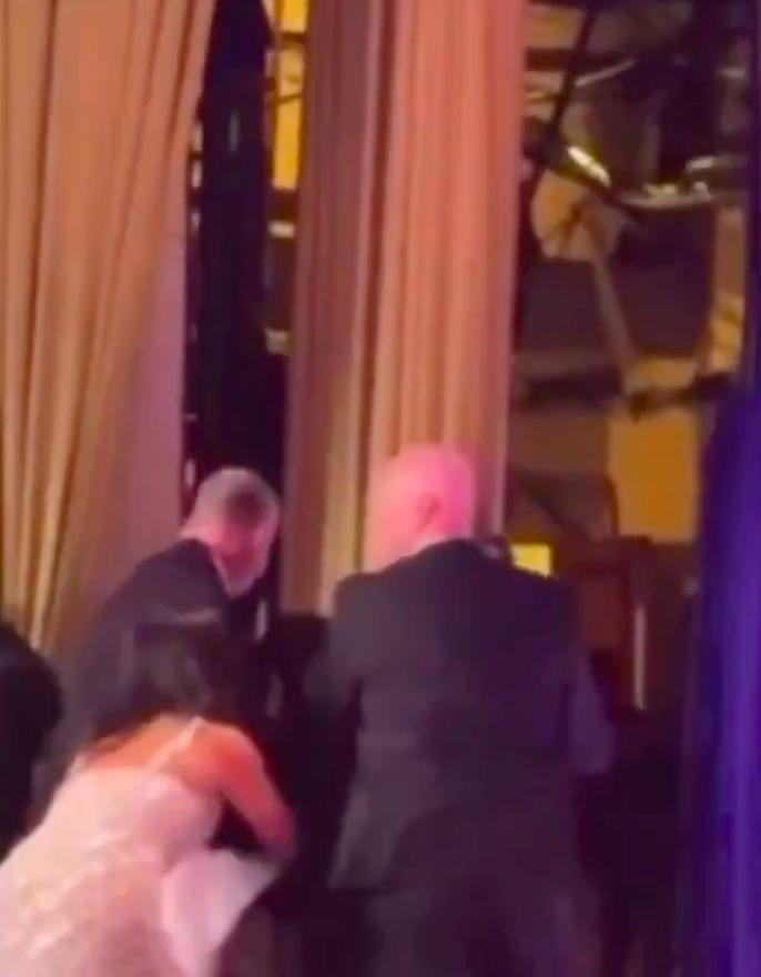 其实,细看万斯离场的细节,就能注意到当时特勤先是往上拽了万斯一把,企图把他拽离座位。但是以万斯的体重,这一拽不过是把他的西装往上扯了一把;万斯继续坐在那里纹丝不动。也就是说,坐在椅子里的万斯,如果自己不站起来,特勤是无法帮助他离开的。一秒之后,万斯反应过来,立刻站起来转身往左边离场。拽他的特勤才得以护着他一起跑了下去。