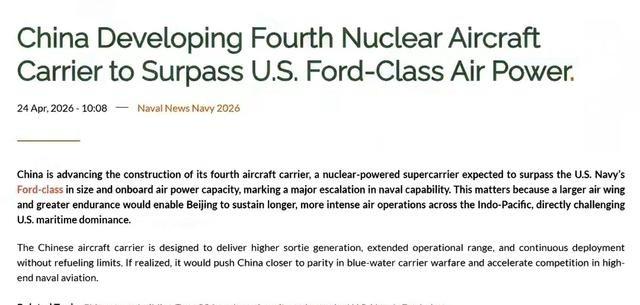 到了2026年4月,相关说法又被进一步放大。有外媒把所谓004型航母说成满载排水量可达11万到12万吨,甚至搭载100架以上舰载机,还拿它和美国福特级航母比较。