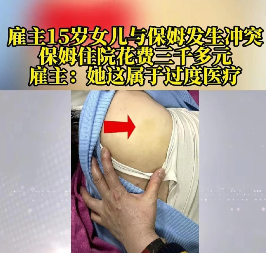 重庆,55岁保姆因为说话声音有点大,雇主15岁的女儿觉得影响自己吃饭,便骂骂咧咧,还冲出去给了保姆背上重重一击。保姆瞬间疼得喘不上气,头疼头晕,到医院检查,发现肩膀和背部有淤青,做了胸部和脑部CT,并住了院,前前后后花费3000多元。保姆希望雇主承担费用,但雇主表示,女儿都没将她推倒,她又做CT又住院,属于过度治疗,明显是想敲诈,最多给她1000块。这态度让保姆气愤又心寒,立刻报警。