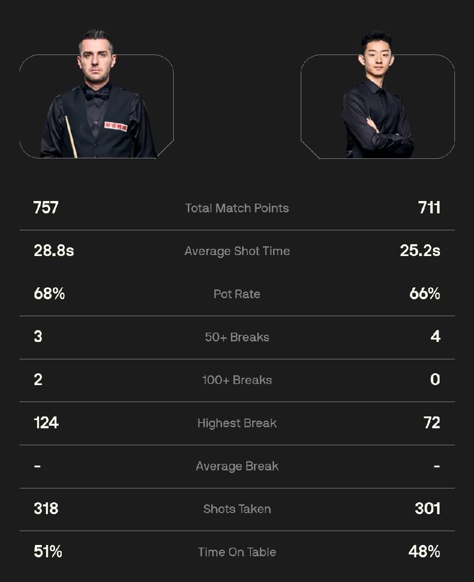 第一阶段,开局塞尔比打出单杆123、124分,连赢两局,先声夺人、气势逼人!22岁的中国小将面对不利局面沉着应战,连赢三局,比分反超至3-2;8局比赛比赛结束,4-4战平。