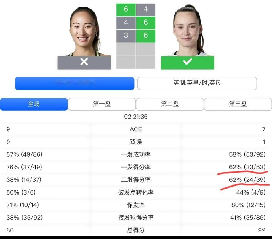 赛后的技术统计显示:郑钦文输就输在对对手二发的压迫感不强,造成莱巴一发和二发的得分率是一样的62%。不过这也能理解,作为正手强力上旋选手,接发球上面肯定没有对手莱巴这样的平击女来的压迫感强。