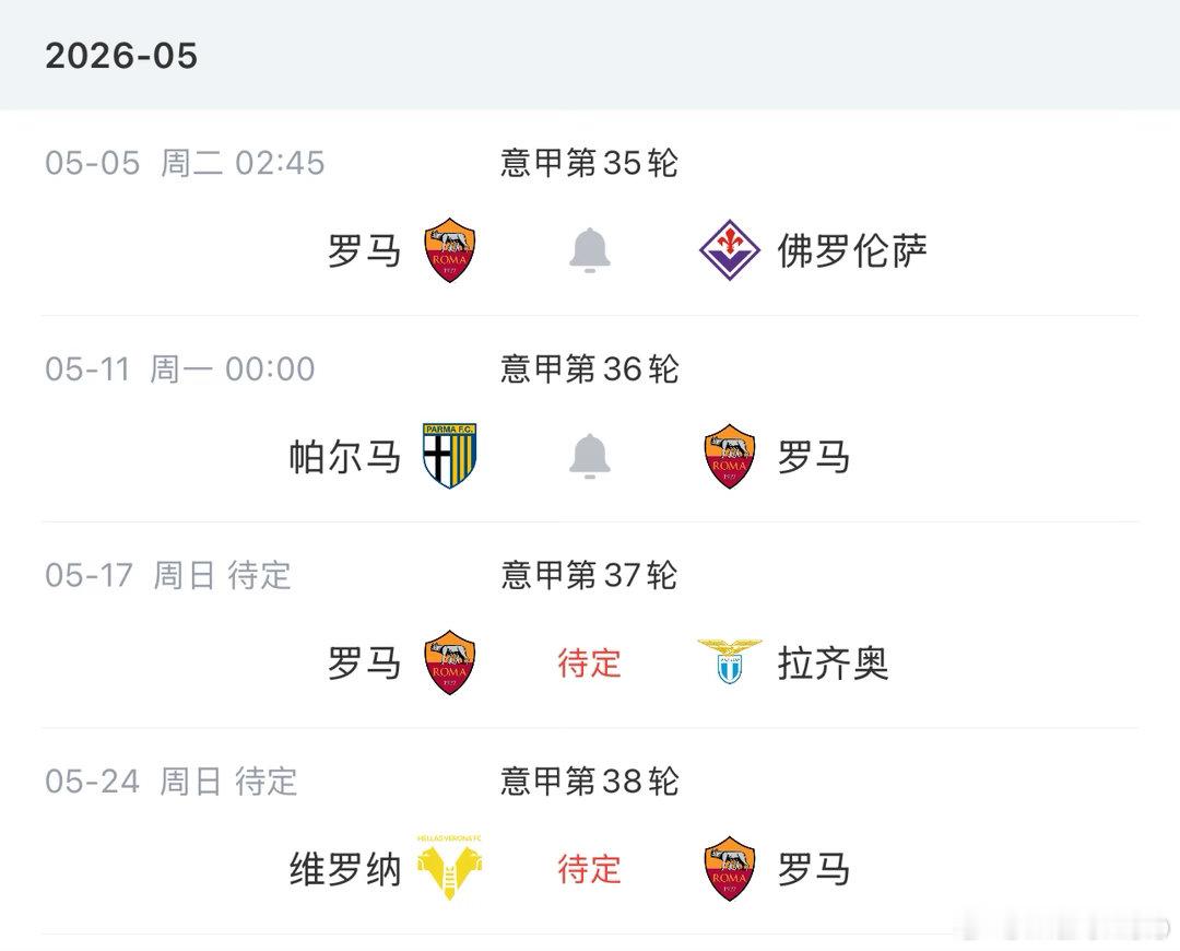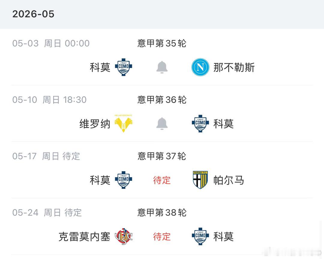 战平米兰后,你妇对科莫和罗马的领先优势缩小至2.5分和3.5分,接下来5月的每场比赛都是决战,保级球队维罗纳将和三支球队交锋,真正主导这场争四大战。