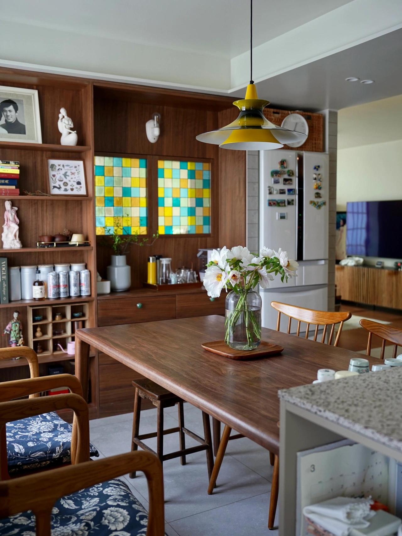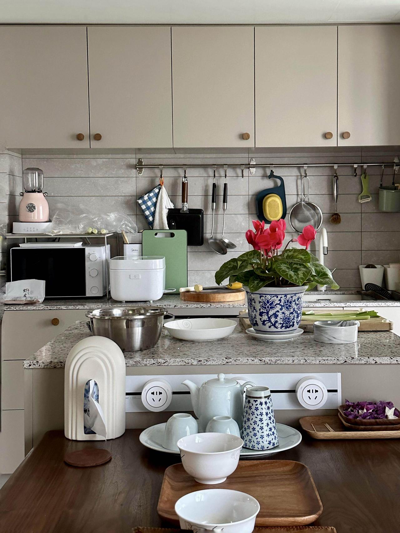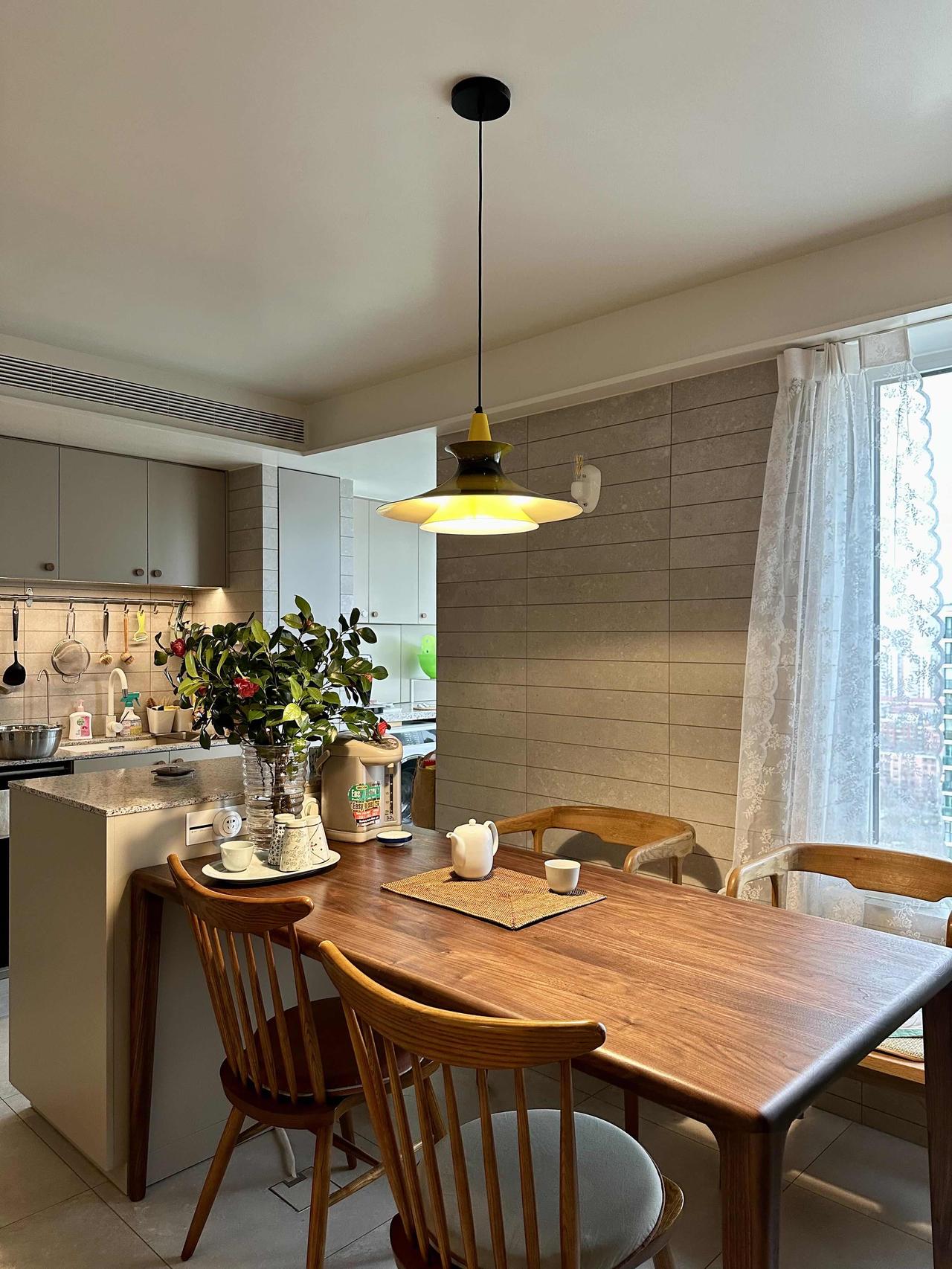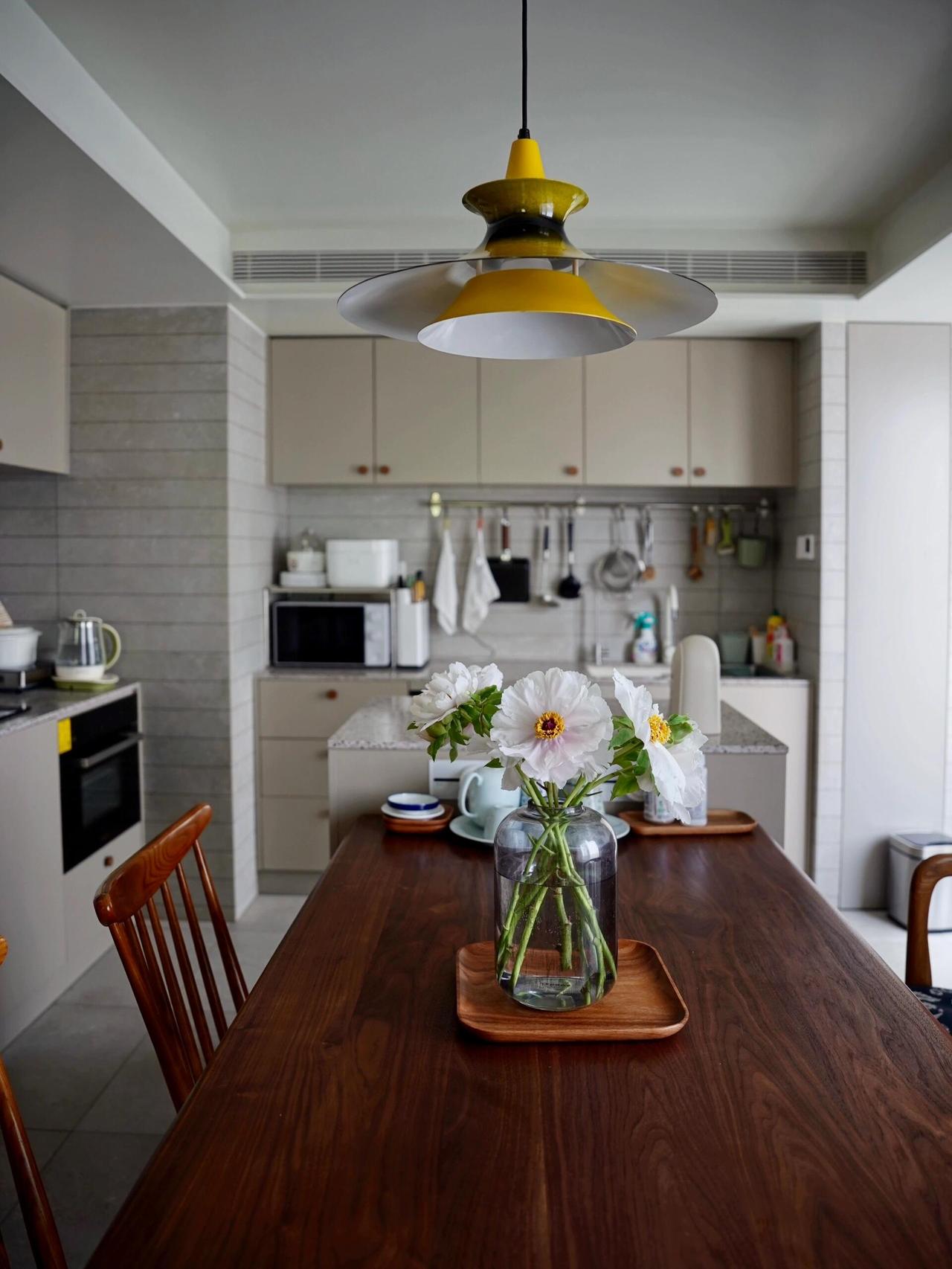 这套房子有十几个年头了,父母们旧物件不舍扔老习惯改不掉,本就不大的家里堆得到处都是没用的东西,原来厨房又小又挤,母亲弯腰做饭时连转身都费劲,装修时她把厨房和次卧之间的墙拆掉,改成开放式,再加一张大桌子,本来逼仄的房子一下子敞亮了,一家人能一起做饭、聊天、吃饭。