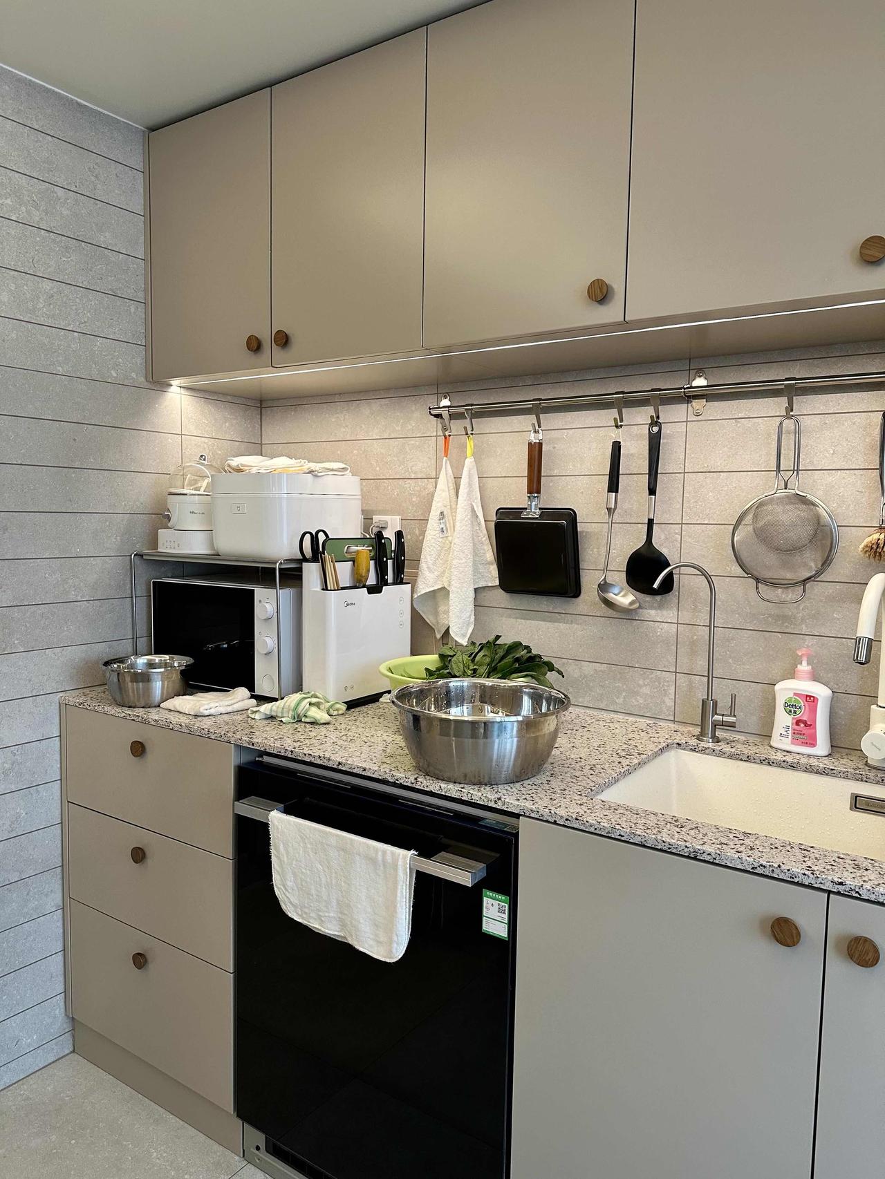 对于上了年纪的人来说,厨房是重中之重,操作台从一字换成L型,旁边加个小岛台——下面储物,上面放电饭煲,洗碗机、净水器该配的配好,柜子能做多少做多少,最重要的是,地面一定要平,一盏灯一定要亮——老年人眼神不好,摔不得。