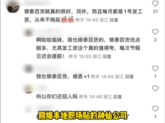 杭州的神仙公司有多懂打工人杭州企业的神仙发薪日被杭州银泰百货狠狠圈粉,不愧是口碑优质企业。坚守准时发薪原则,每月一日稳定到账,节假日主动提前发薪,真诚对待员工,这才是理想中的神仙公司。