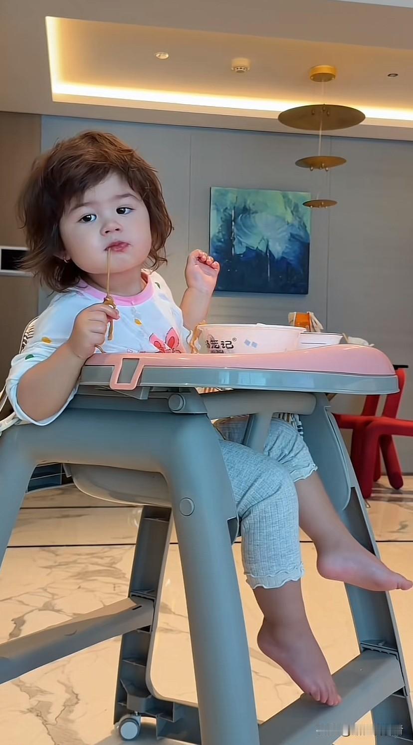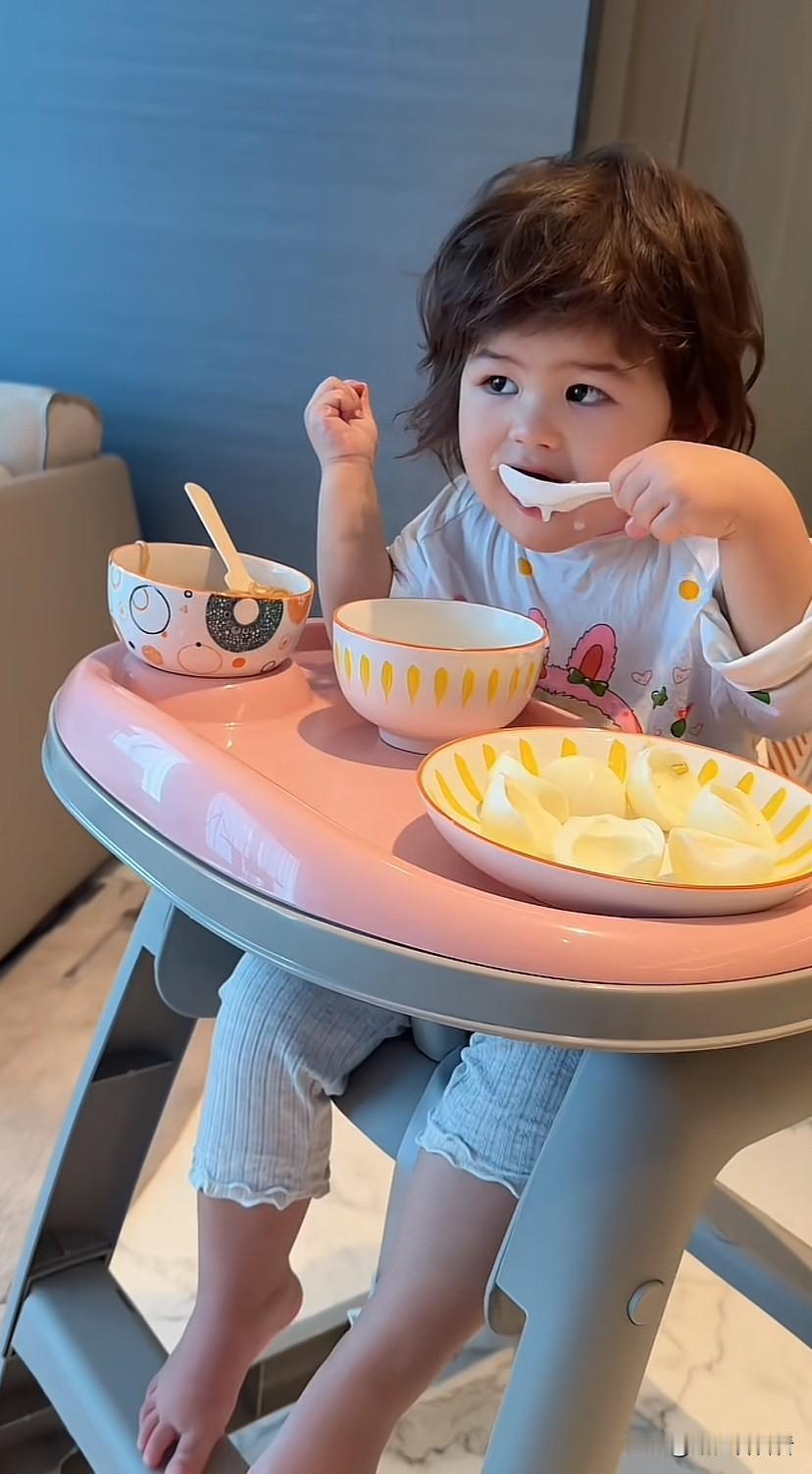小凯莉的胃口是真的好,用叉子叉起来就往嘴里放,喝着白米粥看着动画片,动手能力很强,高高大大,白白胖胖的,真的太可爱了。