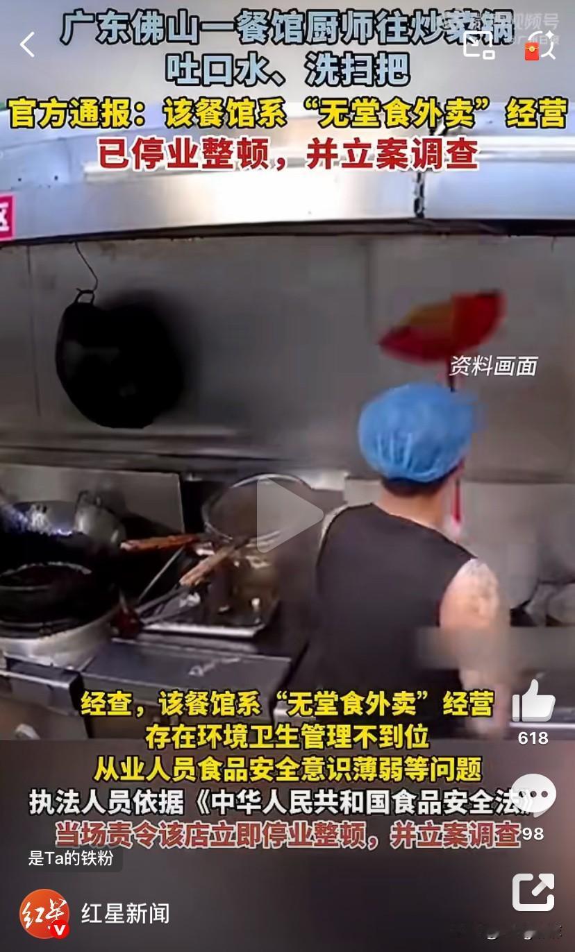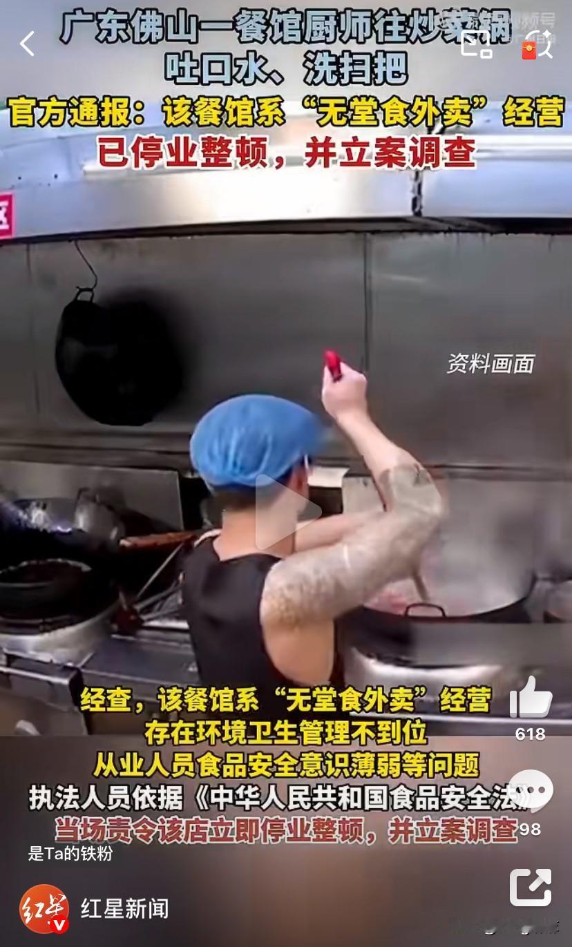 “这厨师太恶心了!”4月25日,广东佛山,网友在一家名为“矮萝卜.江西菜馆” 的餐馆取餐时,意外发现厨师在炒菜时竟然朝锅里吐口水,随后又将食材倒入锅中烹制。