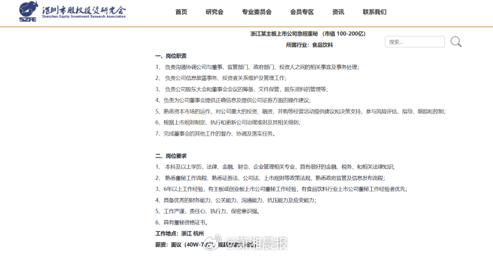 “浙江某主板上市公司急招董秘(市值100-200亿),工作地点杭州,薪酬面议(40W-70W,视具体能力而定)。”这是浙江一家食品饮料上市公司紧急挂出的董秘招聘广告。