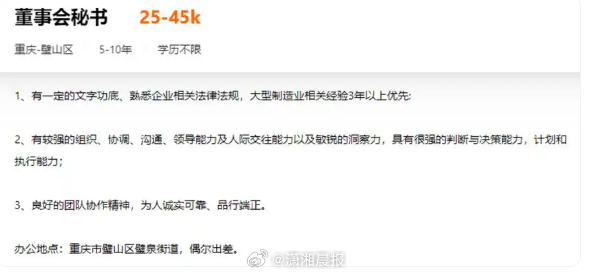 与此同时,位于重庆市的某食品上市公司正在“不限学历”招聘董秘。招聘信息显示,该职位薪酬为25K至45K(月薪)。换算成年薪约30万至54万元,职位办公地点位于重庆市璧山区璧泉街道,公司行业为食品饮料。为了吸引人才,其在工作地点一项特别标注:偶尔出差。