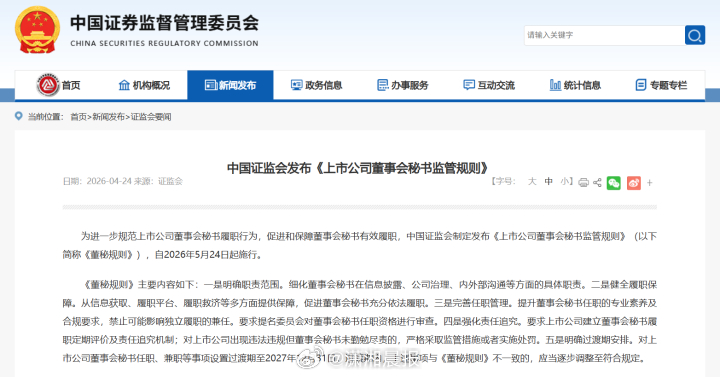 【#一夜之间数千上市公司董秘岗位空缺#】2026年4月24日,中国证监会正式发布《上市公司董事会秘书监管规则》,这一看似常规的监管文件,却在A股市场掀起了波澜。新规明确禁止董秘兼任经理、分管经营业务的副经理、财务负责人,直接触动了近千家上市公司的神经。据悉,目前已有超过1200名在职董秘面临岗位调整,一场规模空前的董秘“换血”潮正在资本市场悄然上演。