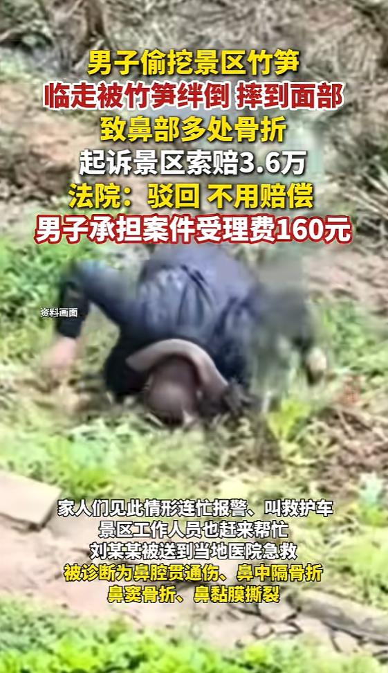 “理不直气也壮!”重庆,一男子带家人去景区游玩,他不逛景点,却跑到竹林里挖竹笋,不料一个不小心,被竹笋根部绊倒,鼻子被竹笋尖狠狠戳穿,事后男子不反思自己行为,还将景区告上法庭,索赔3.6万余元!网友:自己作的!