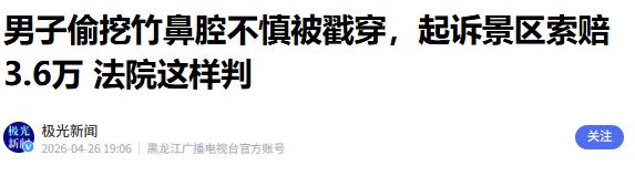 4 月 26 日重庆发生一起极具争议的意外事件,一名男子进入正规景区游玩,不遵守游览规则欣赏风景,私自闯入周边竹林区域,随意采挖新生竹笋。离开途中不慎摔倒,尖锐笋尖直接刺入鼻腔,造成多处损伤,后续治疗花费超 2.6 万元,男子反倒起诉景区索要 3.6 万元赔偿,最终审判结果耐人寻味。
