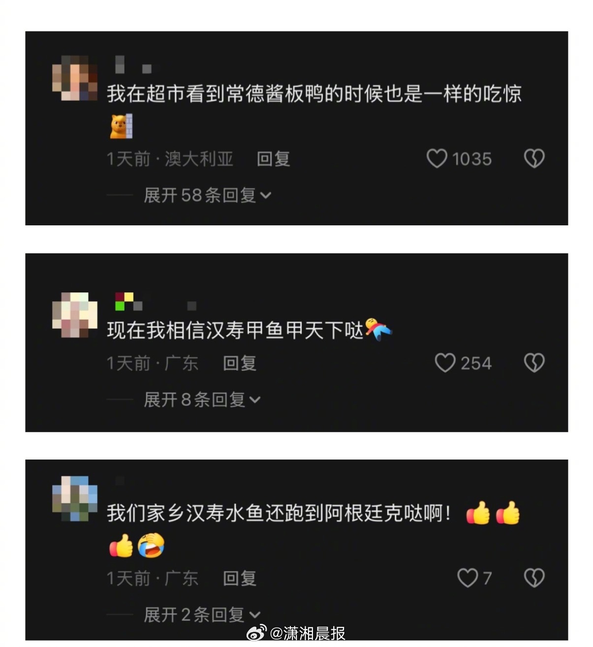 【#中国男子阿根廷超市看到卖汉寿甲鱼#,#阿根廷超市卖汉寿甲鱼约500元一只#】“天哪,真牛。我在全球离中国最远的国家看到了汉寿甲鱼。”近日,常德男子曾先生发布视频称,在阿根廷一超市内看到了汉寿甲鱼,曾先生拍摄的视频显示,当地一超市售卖的货品标签上写着“汉寿甲鱼”,价格98000阿根廷比索(约合人民币480.2元),“我都没想到常德的东西能卖到这边来”,曾先生在评论区回复称。4月27日,·晨视频记者与曾先生取得联系,曾先生介绍,当天是在中华超市看到了在售卖的“汉寿甲鱼”,“中国产品还是很多,老干妈方便面,到处都有卖的,像这种精确到汉寿县的第一次看到,而且又是甲鱼。”曾先生表示,此前也经常去该超市,“以前没有注意过,这是第一次看到甲鱼,也有可能是最近才有。”曾先生说,“本来阿根廷人就不吃甲鱼,在这儿卖甲鱼只能够卖给中国人。这边的中国人里面,福建人居多,福建人也不怎么吃甲鱼,甲鱼我就只见过湖南人吃,我都不知道是卖给谁。”曾先生介绍,当地汉寿甲鱼按只售卖,“一只大概500元人民币,那个很小,在湖南的话可能卖个六七十块钱,我自己家里有餐厅,我知道价格。”去到阿根廷一年多时间,这是曾先生第一次在当地看到常德特产,“很少能看到与湖南相关的东西,当时就觉得汉寿甲鱼确实很牛。”潇湘晨报·晨视频记者张沁 实习生吴盼盼 常德