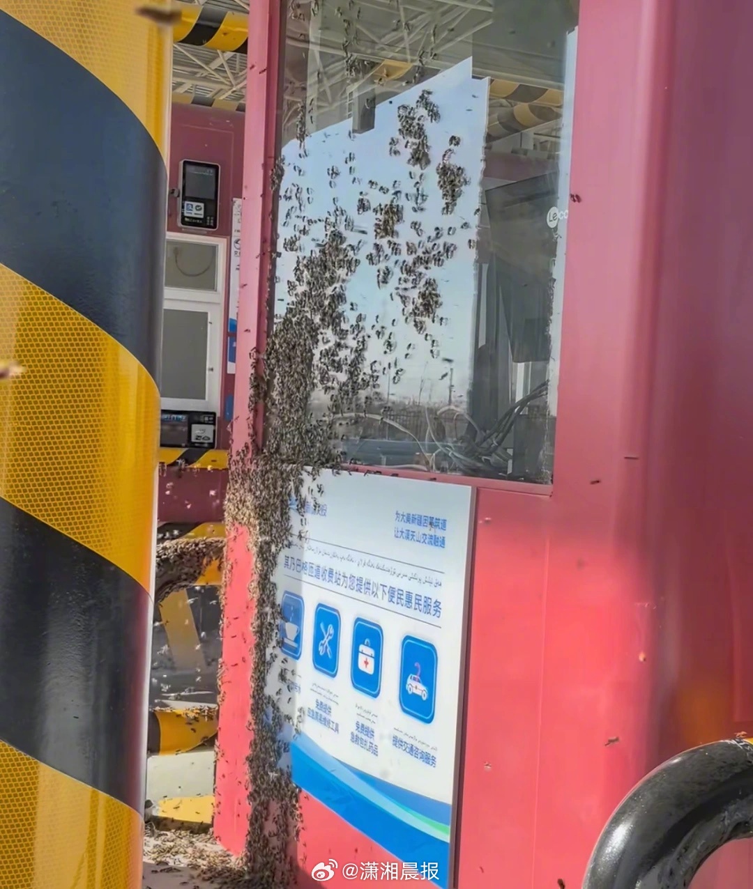 【新疆一#收费站满是蜜蜂工作人员戴头罩取卡#,#收费站回应收费口盘旋大量蜜蜂#:有司机拉了一车蜜蜂,已处理】4月26日,有网友发视频称在新疆一收费站,有大量蜜蜂在一收费口前盘旋,工作人员只能戴上防叮头罩,把窗户打开一条缝将手伸出取通行卡。而在该收费口前方的玻璃上,爬满了大量蜜蜂。该视频引发热议,有网友表示,“鸡皮疙瘩都要起来了。”27日,·晨视频记者通过视频内容发现,该收费站为其乃巴格匝道收费站。同日,其乃巴格匝道收费站站长告诉记者,事发于26日下午5时左右,“收费站检查绿通的时候,有人拉了蜜蜂,我们的人检查的时候一打开,好多蜜蜂就飞出去了。”站长表示,蜜蜂飞出来后,收费站工作人员尝试用火处理,“烟跑出来,蜜蜂就跑掉了。”站长介绍,半小时后此前拉蜜蜂通过收费站的人返回站点将剩余的蜜蜂拉走,“处理好了。”潇湘晨报·晨视频记者朱天翔 新疆