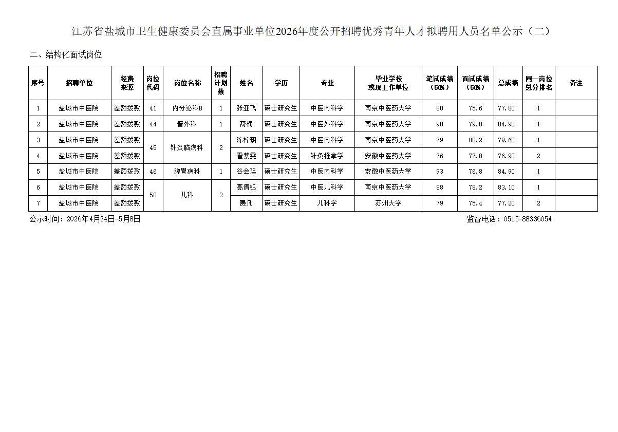 盐城市卫生健康委员会直属事业单位2026年度公开招聘优秀青年人才拟聘用人员名单公示(二),本次共公示22名拟聘人员,均为硕士研究生学历,涉及盐城市中医院、市妇幼保健院、市第四人民医院的临床及管理岗位,含宣杞烨、邵康、曹加龙、芮洁、朱婕、闫启月、邵珊珊、侯起凤、孙汪洋、张莹玉、路祥文、缪淑敏、李姝琦、蔡伟欣、曹一帆、周瑾、张亚飞、裔楠、陈梓玥、霍紫雯、谷会廷、高倩钰、费凡(心内科、针灸脑病科、儿科为多人岗位)。