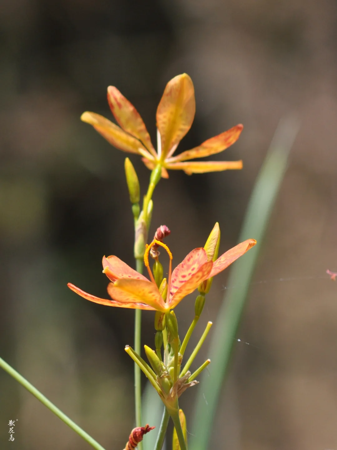 ✨ 花茎顶端分枝成伞房状花序,花瓣六片,橙红色带深红色斑点,形如豹纹蝶翼