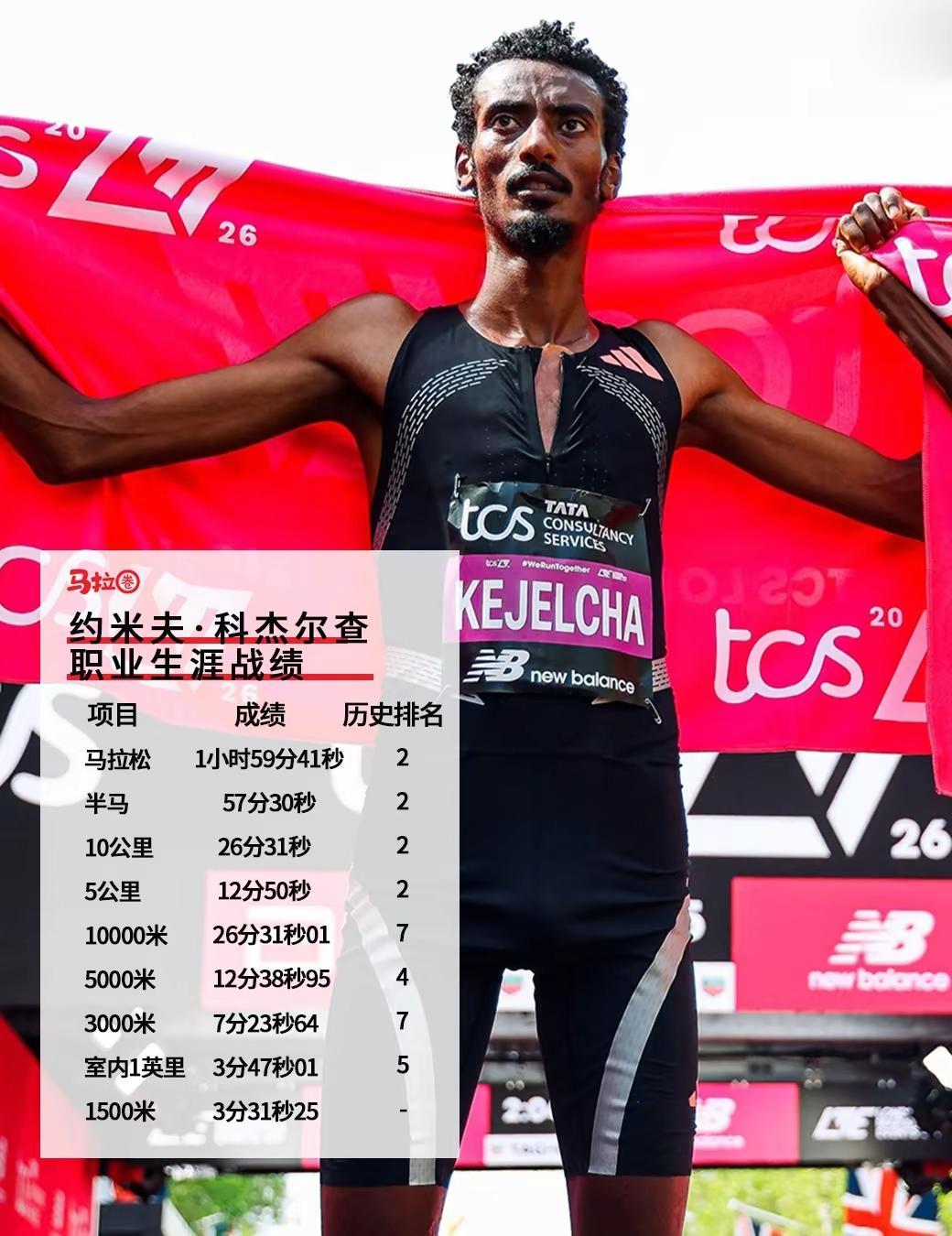 首马破二,看看这种天才其他项目啥水平马拉圈 伦敦马拉松 世界纪录 跑步 2026伦敦马拉松,科杰尔查以1小时59分41秒完成首马,夺得亚军并创造首马纪录,这个成绩也超过了基普图姆保持的2小时0分35秒的原世界纪录,同时他也完成了破二未夺冠的历史性成就科杰尔查身高1米86,长跑运动员又非常瘦,因此被跑友戏称“竹竿”,另外他在比赛中经常夺得第二名,也被取了个“万年老二”的称号,但玩笑归玩笑,他的实力毋庸置疑,并且非常强悍,各个项目都是历史顶级水平马拉松 1小时59分41秒 历史第二半马 57分30秒 历史第二10公里 26分31秒 历史第二5公里 12分50秒 历史第二10000米 26分31秒01 历史第七5000米 12分38秒95 历史第四3000米 7分23秒64 历史第七室内1英里 3分47秒01 历史第五1500米 3分31秒25最后提一句,1小时59分41秒的首马纪录,好歹也算个纪录,这应该很难被破掉了吧?首马第一人应该还是很稳当的