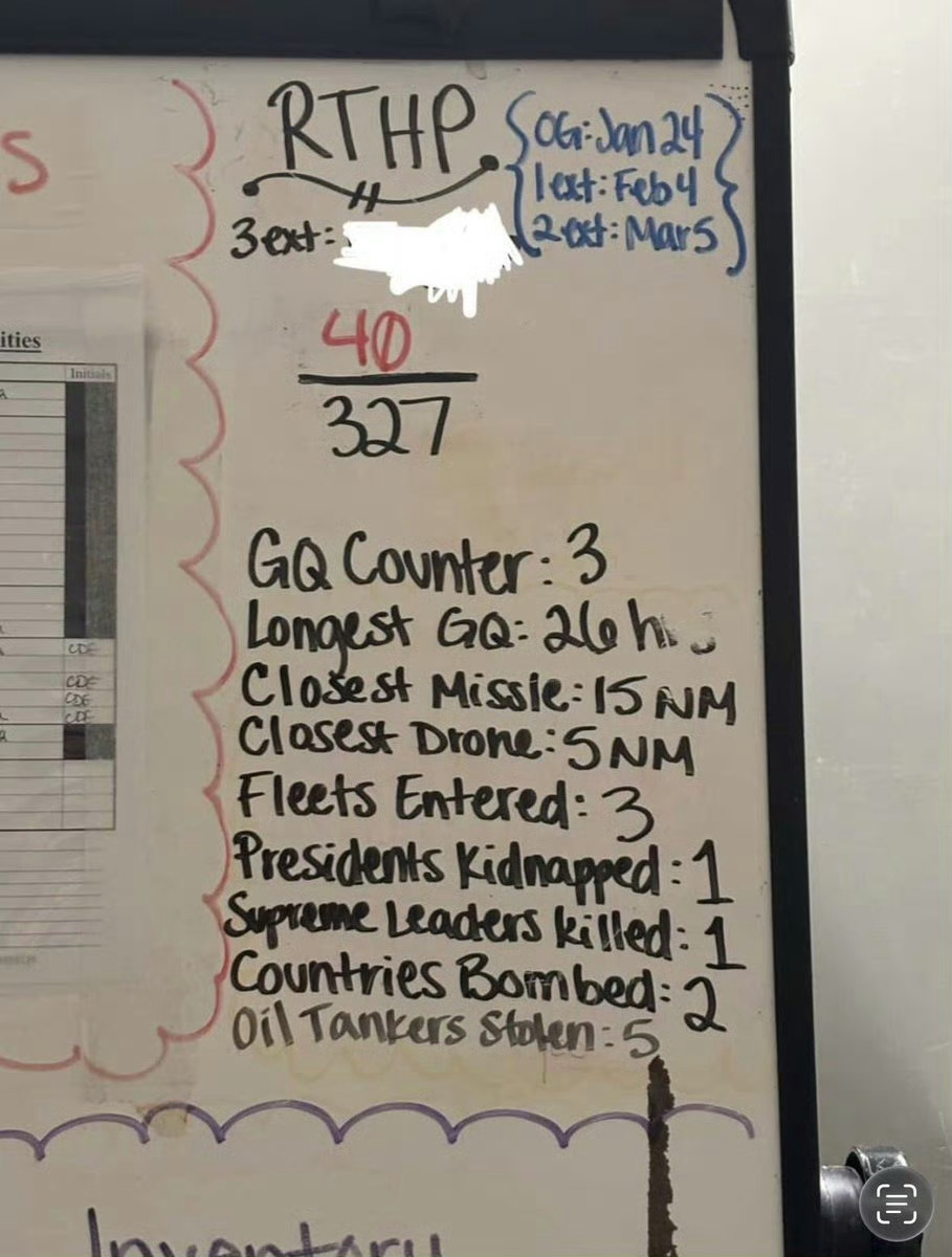 福特号的白板照片正在美国 OSINT 之间广为流传。已部署327天,剩余40天。全员战备计数器:3 次 最长全员战备值班时长:26 小时 最近导弹距离:15 海里最近无人机距离:5 海里 已到达舰队数量:3 绑架总统人数:1 打死最高领袖数量:1轰炸国家数量:2 劫持油轮数量:5 海外新鲜事美伊以冲突热点观点