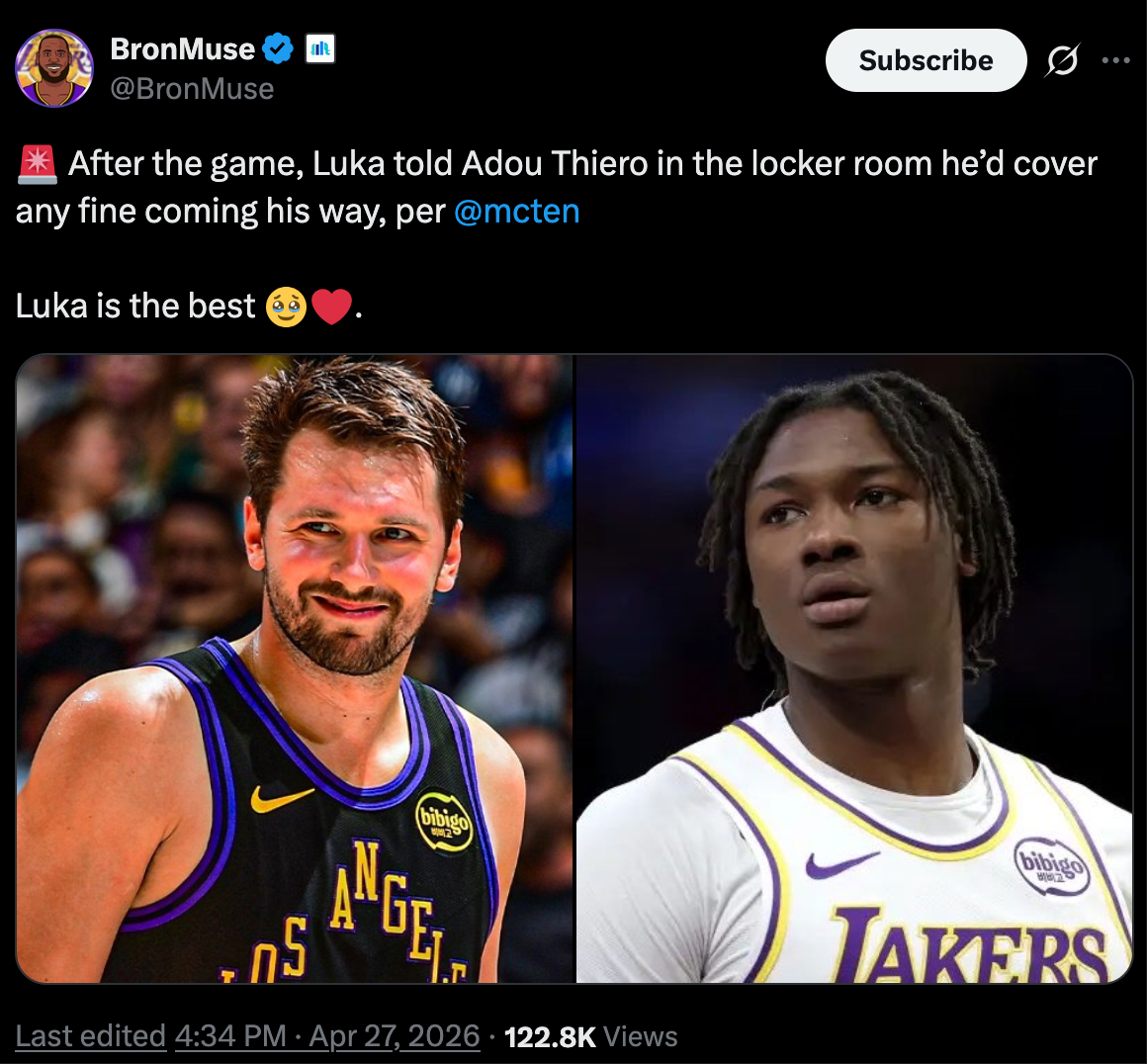 卢卡赛后告诉阿杜,不管后续开出多少罚款,都由他来承担😭