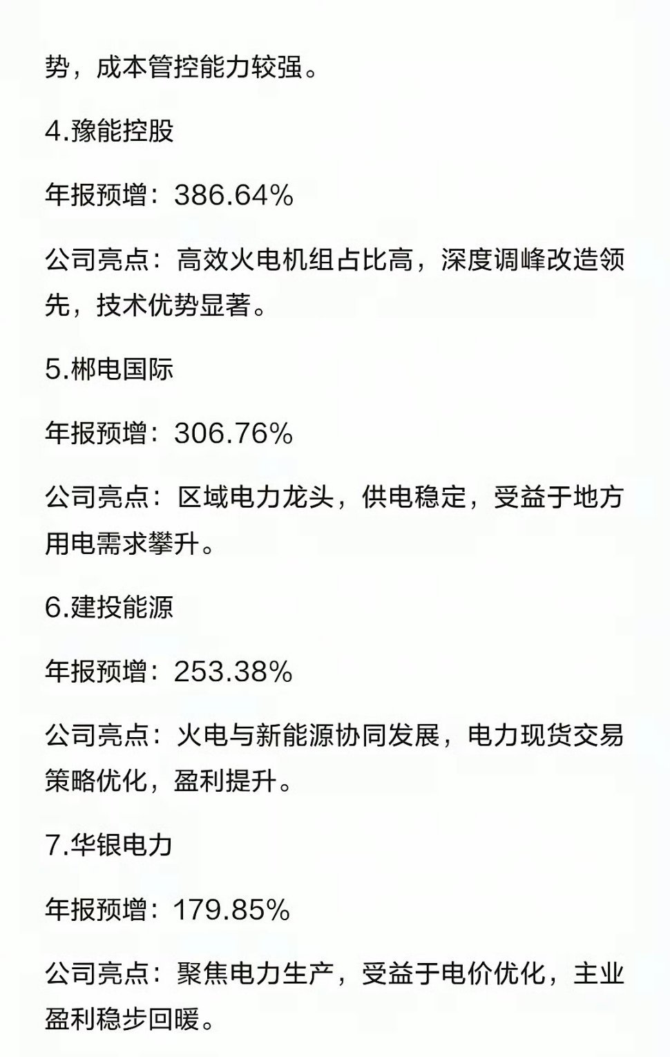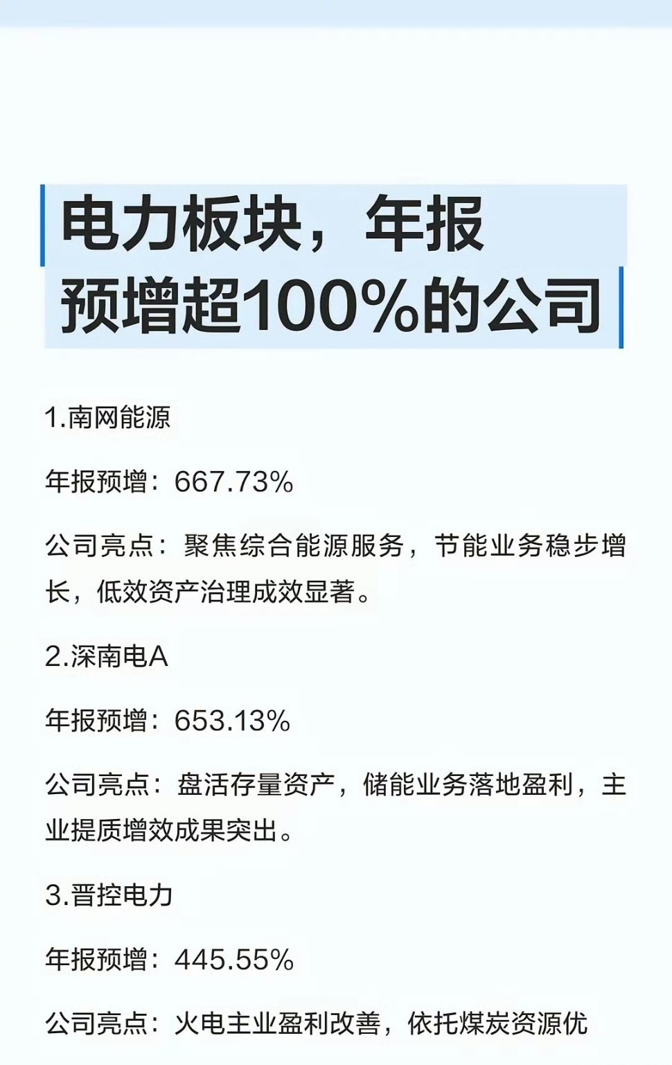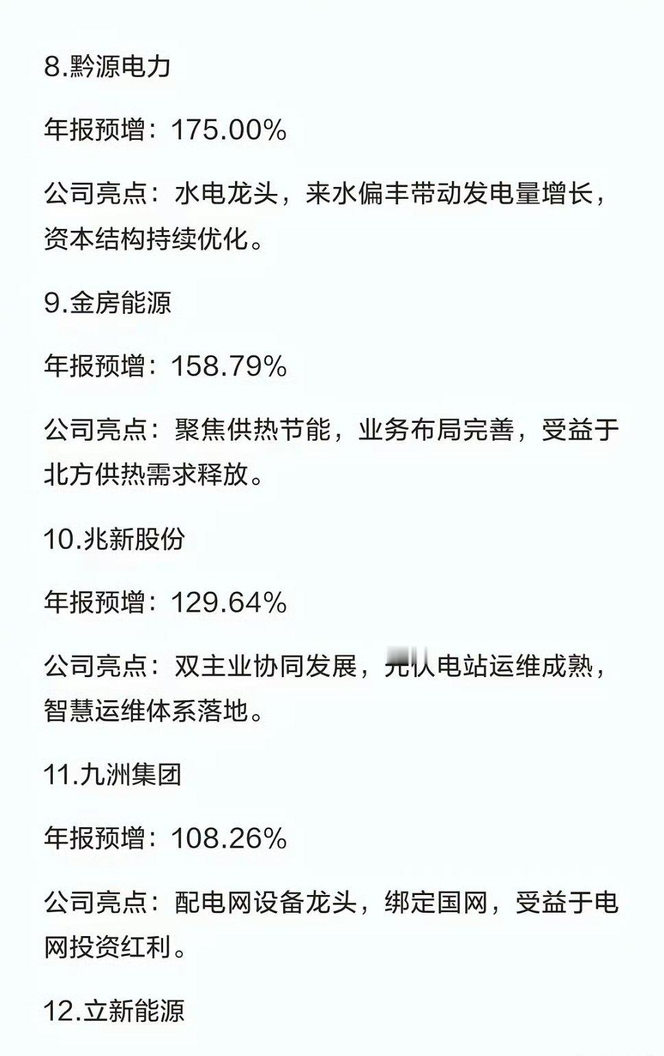 电力板块,年报预增超100%的公司1.南网能源年报预增:667.73%公司亮点:聚焦综合能源服务,节能业务稳步增长,低效资产治理成效显著。2.深南电A年报预增:653.13%公司亮点:盘活存量资产,储能业务落地盈利,主业提质增效成果突出。3.晋控电力年报预增:445.55%公司亮点:火电主业盈利改善,依托煤炭资源优势,成本管控能力较强。4.豫能控股年报预增:386.64%公司亮点:高效火电机组占比高,深度调峰改造领先,技术优势显著。5.郴电国际年报预增:306.76%公司亮点:区域电力龙头,供电稳定,受益于地方用电需求攀升。6.建投能源年报预增:253.38%公司亮点:火电与新能源协同发展,电力现货交易策略优化,盈利提升。7.华银电力年报预增:179.85%公司亮点:聚焦电力生产,受益于电价优化,主业盈利稳步回暖。8.黔源电力年报预增:175.00%公司亮点:水电龙头,来水偏丰带动发电量增长,资本结构持续优化。9.金房能源年报预增:158.79%公司亮点:聚焦供热节能,业务布局完善,受益于北方供热需求释放。10.兆新股份年报预增:129.64%公司亮点:双主业协同发展,光伏电站运维成熟,智慧运维体系落地。11.九洲集团年报预增:108.26%公司亮点:配电网设备龙头,绑定国网,受益于电网投资红利。12.立新能源年报预增:104.26%公司亮点:专注新能源发电,光伏风电布局完善,业绩稳步增长。13.京能电力年报预增:103.69%公司亮点:大型电力运营商,电源结构优化,区域供电优势明显。