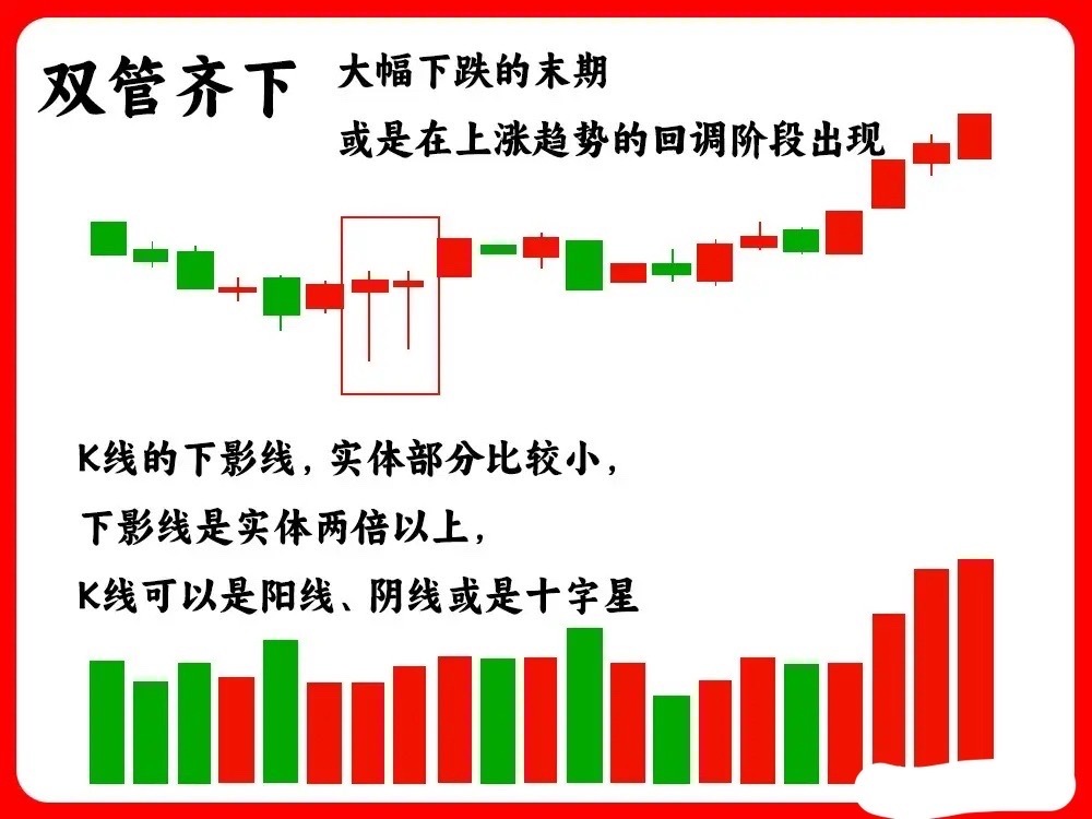 三、双管齐下股价处于低位盘整阶段时,出现两根金针探底的K线——连续两根下影线很长、实体较小的K线(可以是阴线或阳线),且它们的最低价基本相同,形成双重支撑,说明下方承接力量不弱。双管齐下的走势一般比单一的金针探底更强势。