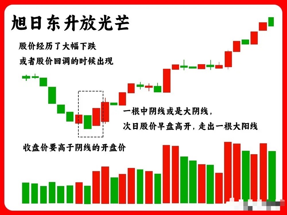 二、旭日东升这是一种较强势的底部特征,出现在下跌趋势中。第一根K线为中大阴线,成交量没有明显放量,说明空方力量开始衰竭。次日股价早盘高开,收盘时覆盖了前一日阴线的最高价,同时成交量放大,量能越大越好,表明当天买盘力量强劲。旭日东升形态往往比曙光初现更为强势。