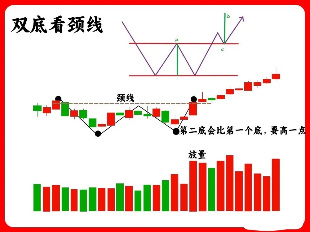 五、双底看颈线也叫W底,是很经典的形态。股价在低位盘整时,出现两次探底后回升,形成W形。右边的底部通常比左边的底要高,中间反弹的高点就是该形态的颈线位置,我们可以画一条线来标记。当股价从右底反弹向上时,需关注其走势:若反弹突破颈线并有效站上压力位,但过程中无量,则为假突破。还有一个细节是,右底位置一定要出现缩量下跌,缩量意味着主力控盘、锁仓。因此,整个形态中,成交量的放大与缩量会呈现出有序的节奏。