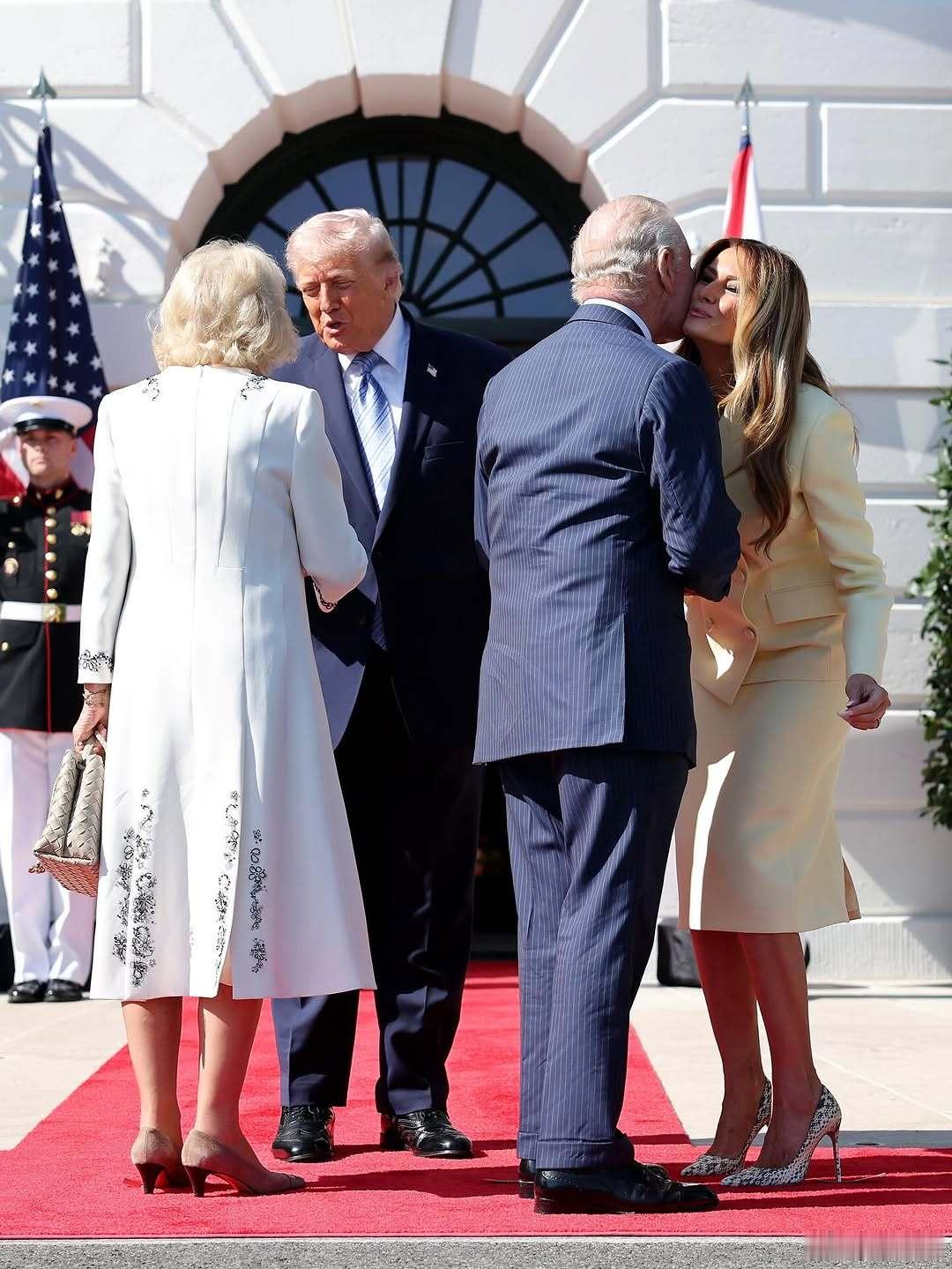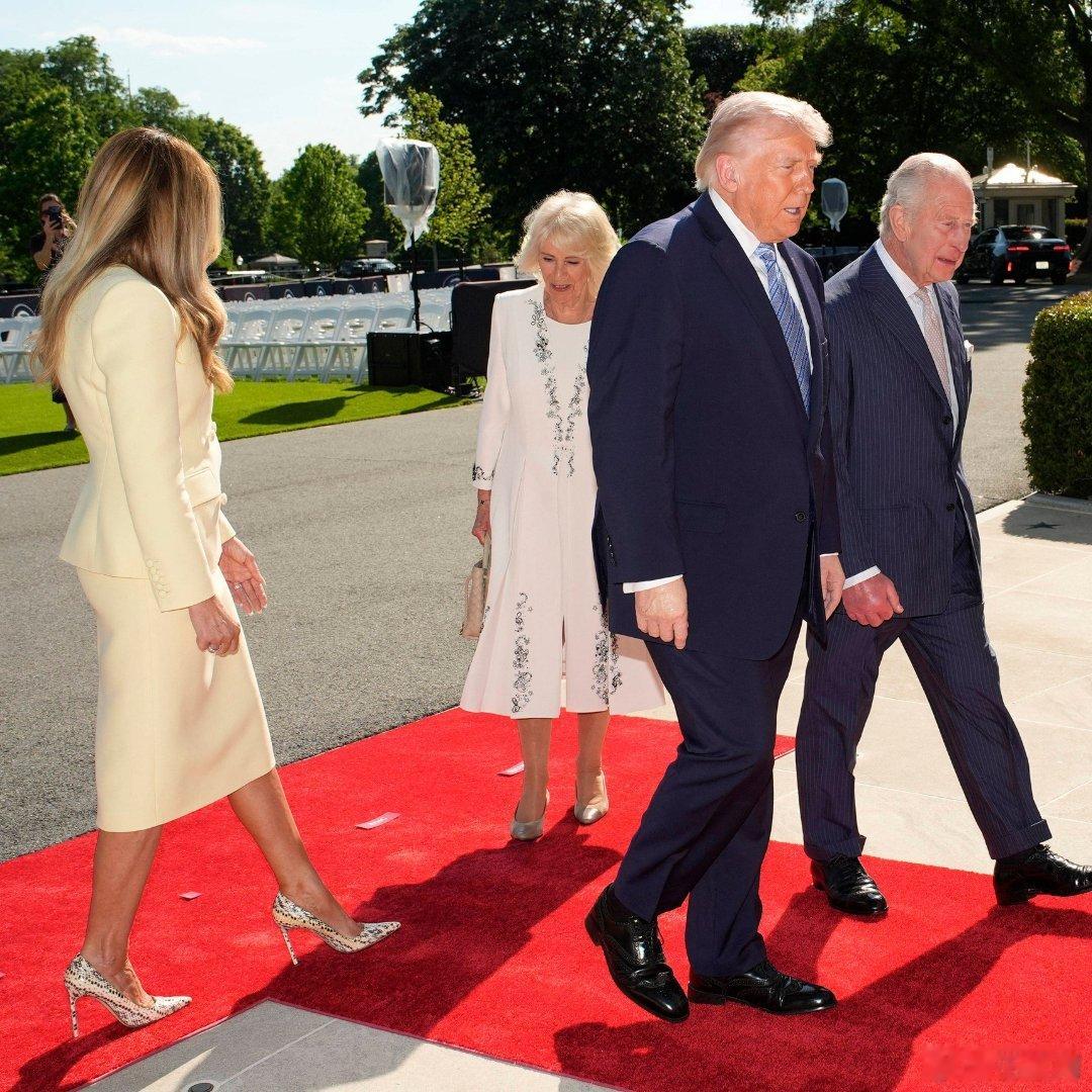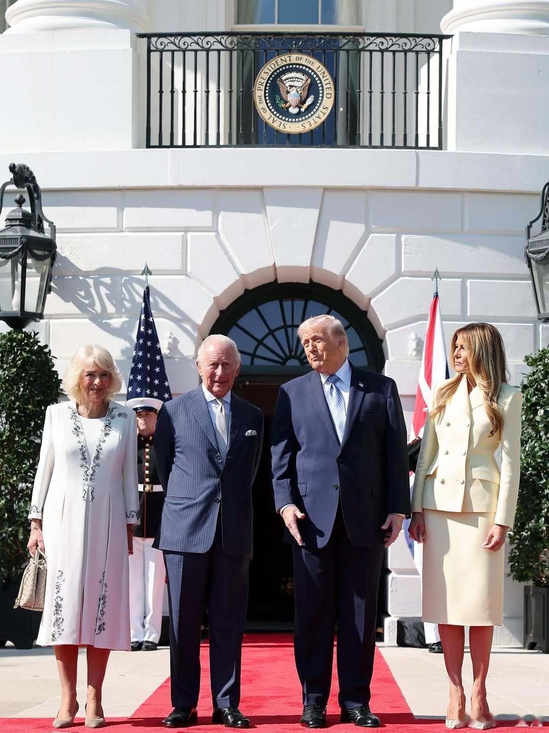 英国王室 🇬🇧🇺🇸4月27日,查尔斯国王和卡米拉王后抵达白宫南门廊,特朗普总统及第一夫人梅拉尼娅到场迎接。世界各国王室美国第一夫人颜色好嫩。王后的礼服来自安娜·瓦伦丁,梅拉尼娅的套装来自亚当·利普斯。