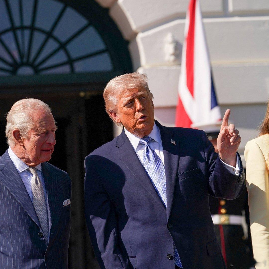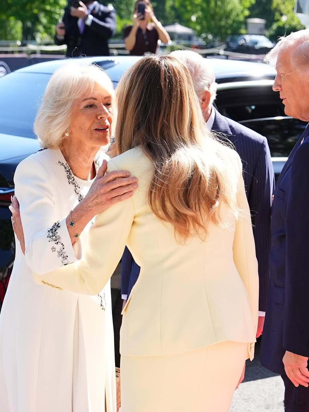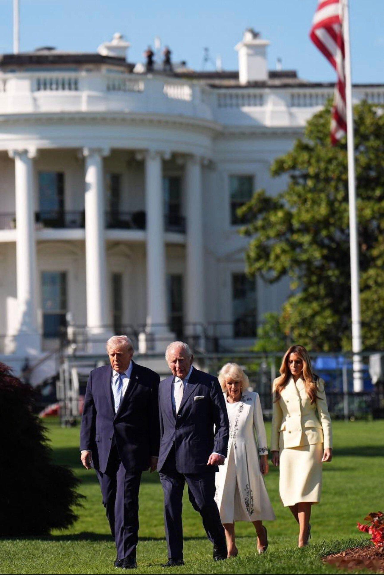 英国王室 🇬🇧🇺🇸4月27日,查尔斯国王和卡米拉王后抵达白宫南门廊,特朗普总统及第一夫人梅拉尼娅到场迎接。世界各国王室美国第一夫人颜色好嫩。王后的礼服来自安娜·瓦伦丁,梅拉尼娅的套装来自亚当·利普斯。