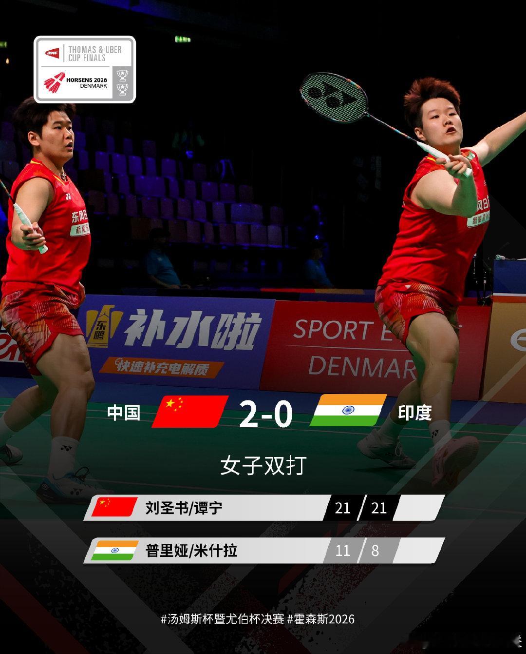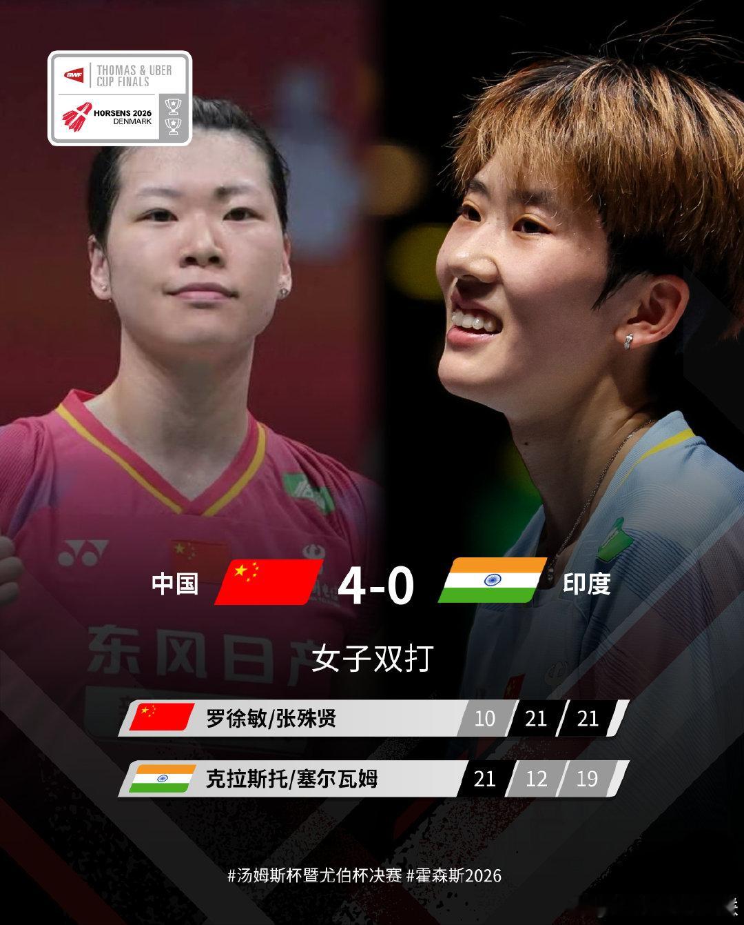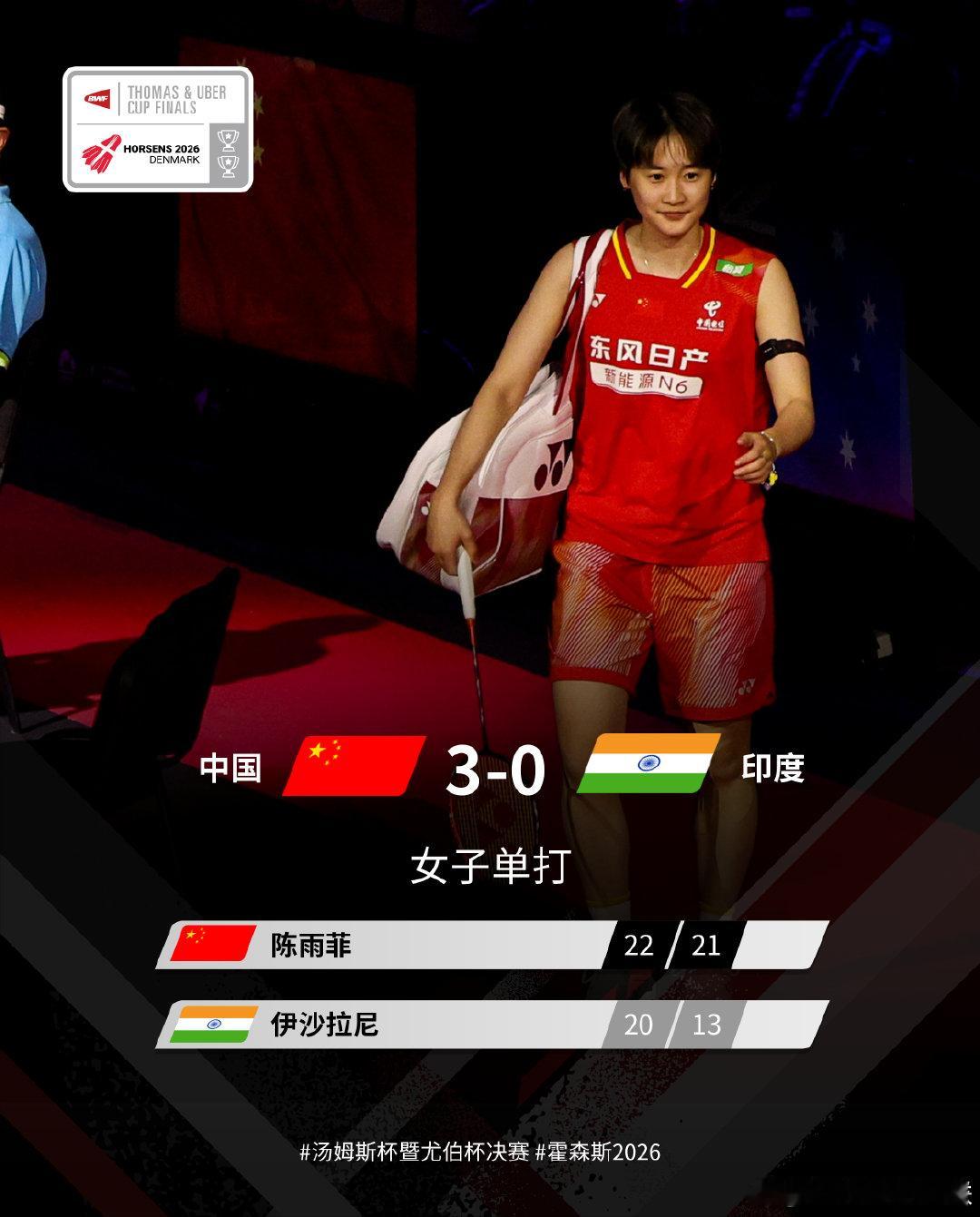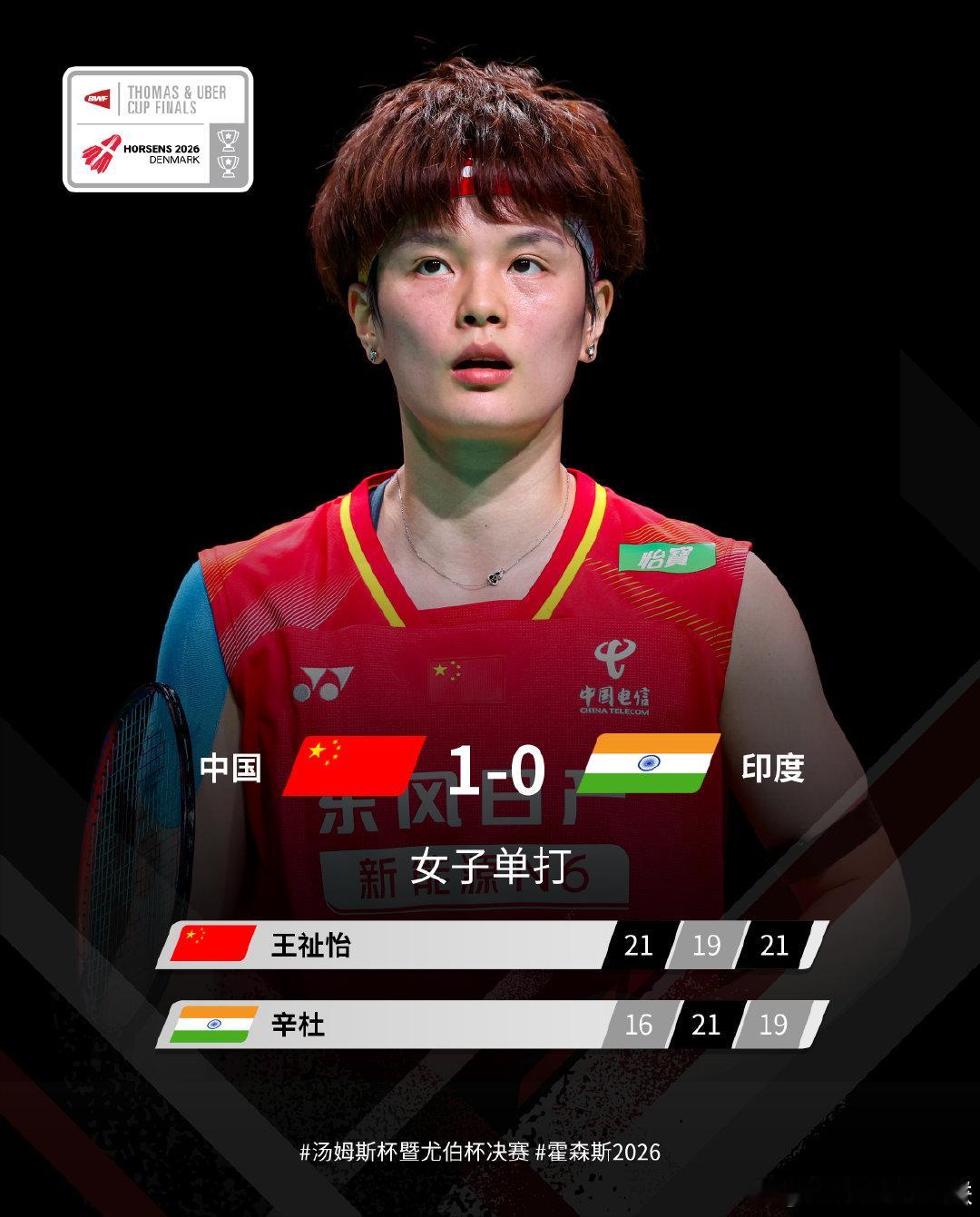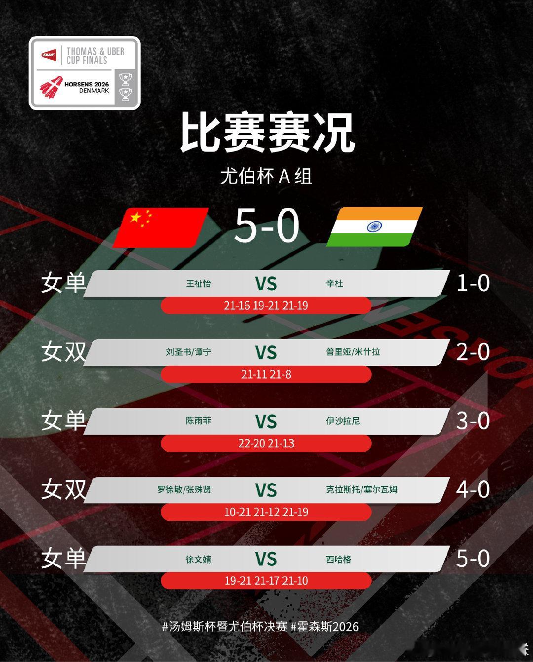 王祉怡21-16、19-21、21-19辛杜刘圣书/谭宁21-11、21-8普里娅/米什拉陈雨菲起22-20、21-13伊沙拉尼罗徐敏/张殊贤10-21、21-12、21-19克拉斯托/塞尔瓦姆徐文婧19-21、21-17、21-10西哈格尤杯中国5比0印度2026年汤尤杯