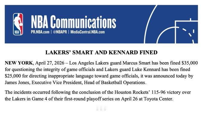 联盟官方宣布:斯马特因质疑赛事裁判的职业操守被罚款3.5万美元,肯纳德则因对赛事裁判使用不当言辞被罚款2.5万美元。
