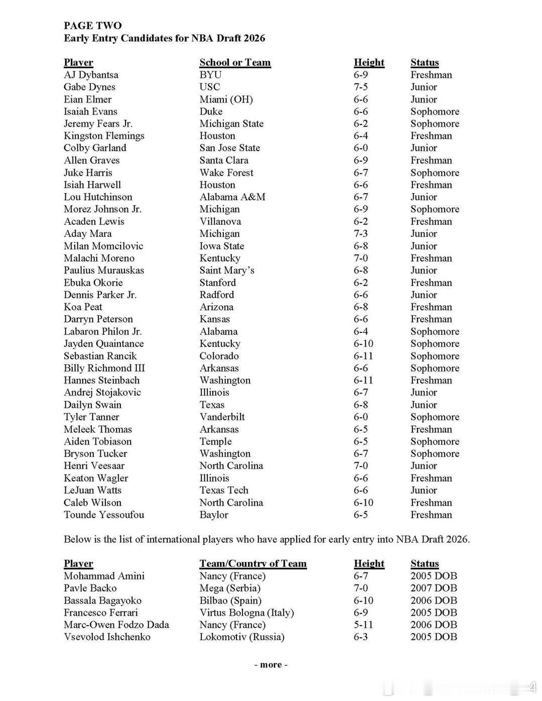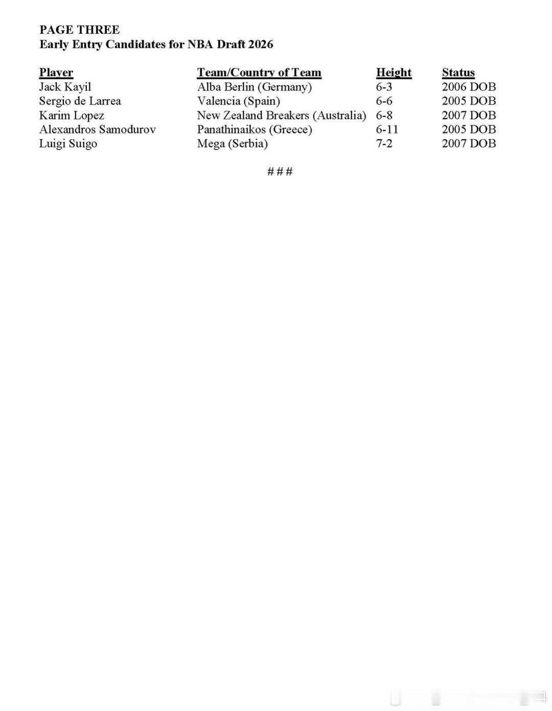 2026年NBA选秀仅有71名球员报名参加,创下自2003年以来的最低参选人数纪录