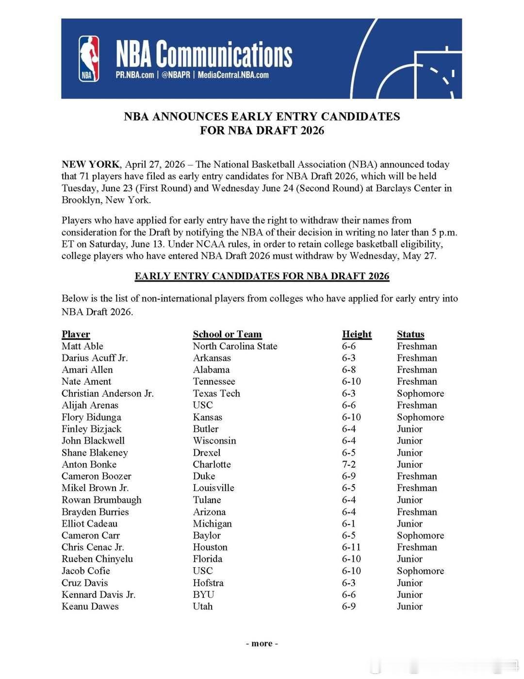 2026年NBA选秀仅有71名球员报名参加,创下自2003年以来的最低参选人数纪