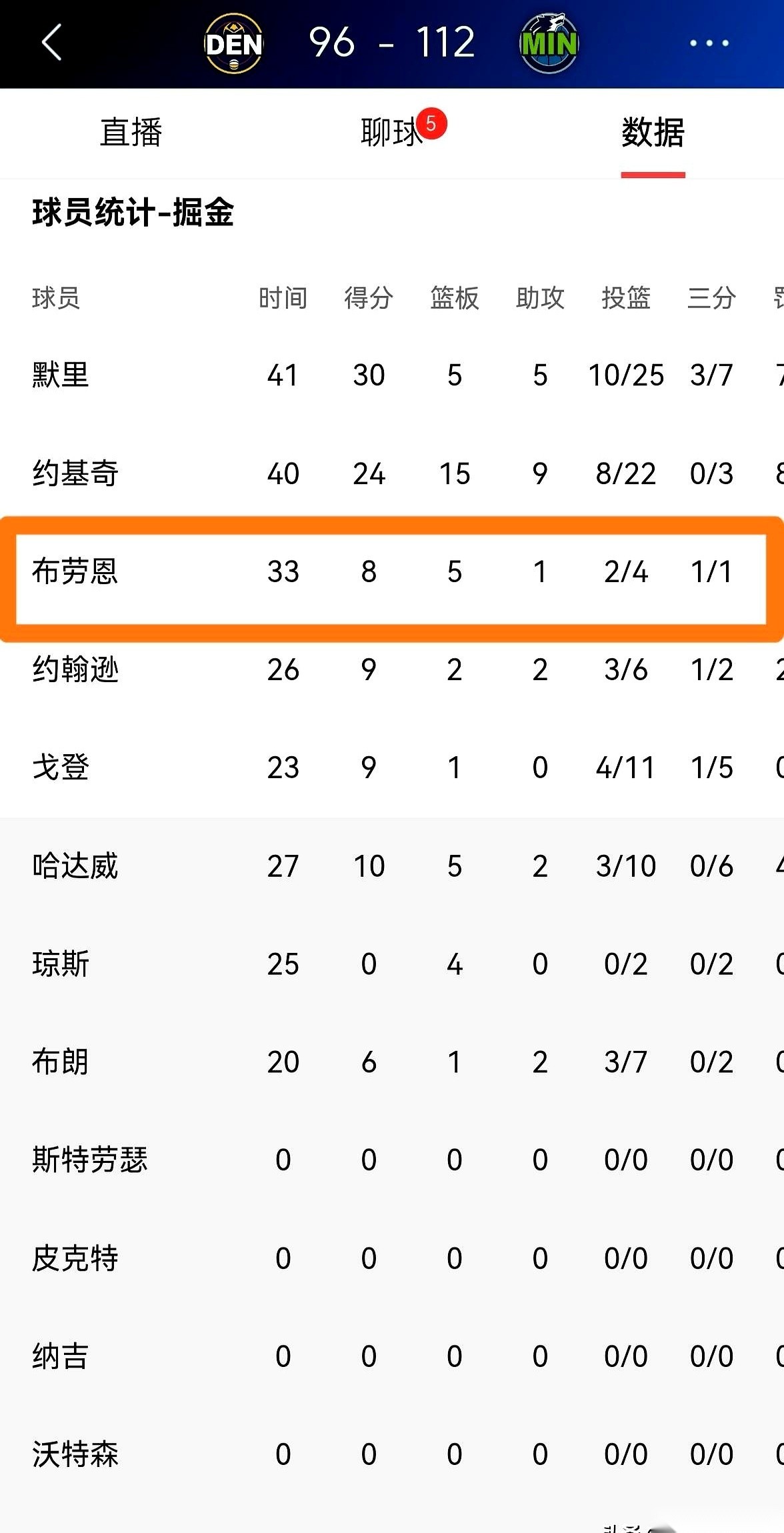 掘金队那个叫布劳恩的,真让人看迷糊了。 首发出战33分钟,教练就给了他...