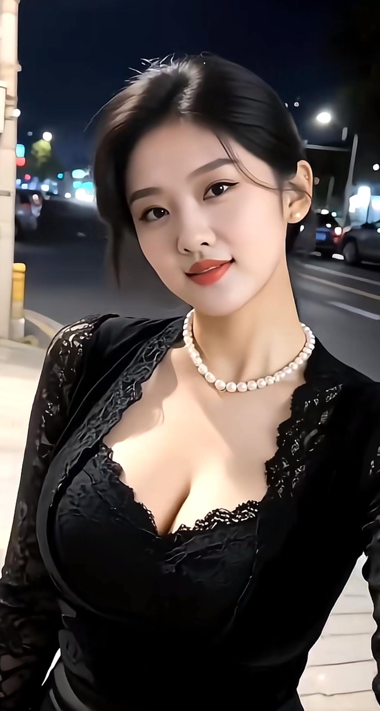 夜晚的都市街景,黑裙与珍珠项链的优雅搭配,尽显女性魅力。分享一下你随手拍的照片