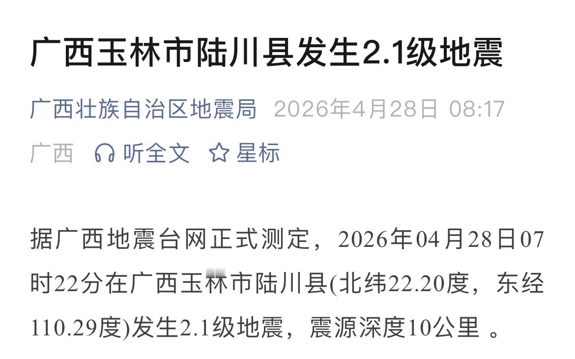 据广西地震台网正式测定,2026年04月28日07时22分在广西玉林市陆川县(北纬22.20度,东经110.29度)发生2.1级地震,震源深度10公里 。(来源|广西壮族自治区地震局)同城热点创作计划 玉林·陆川