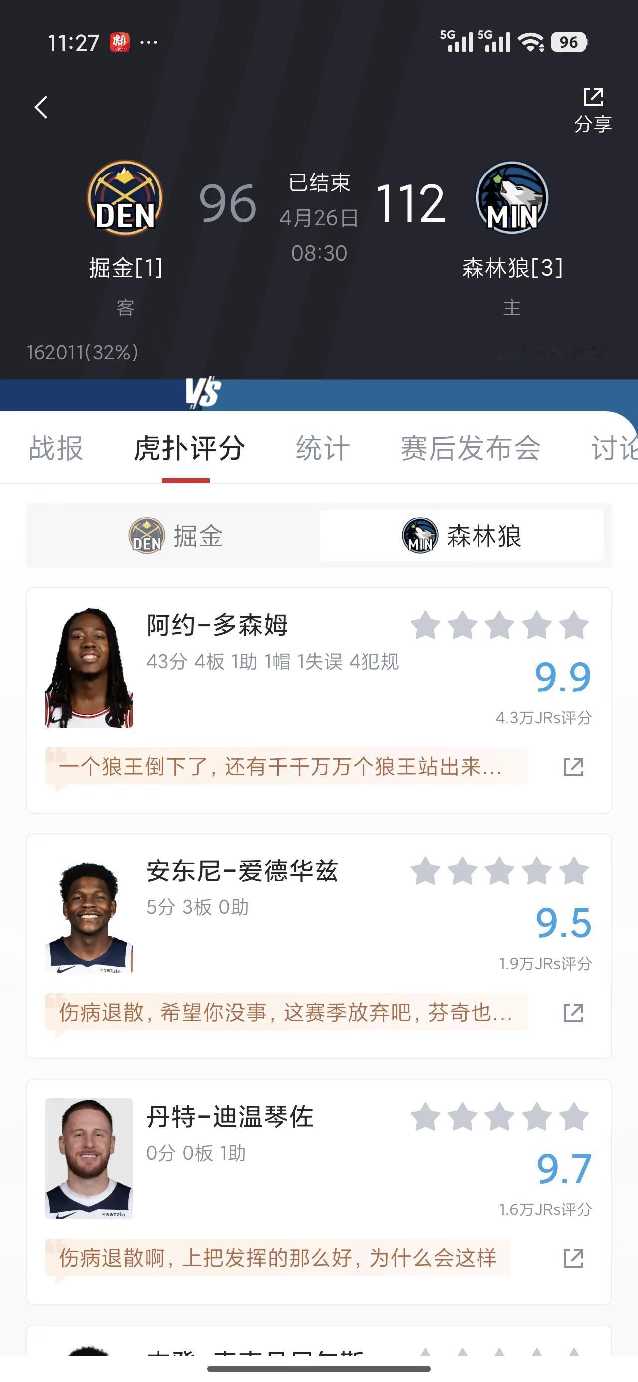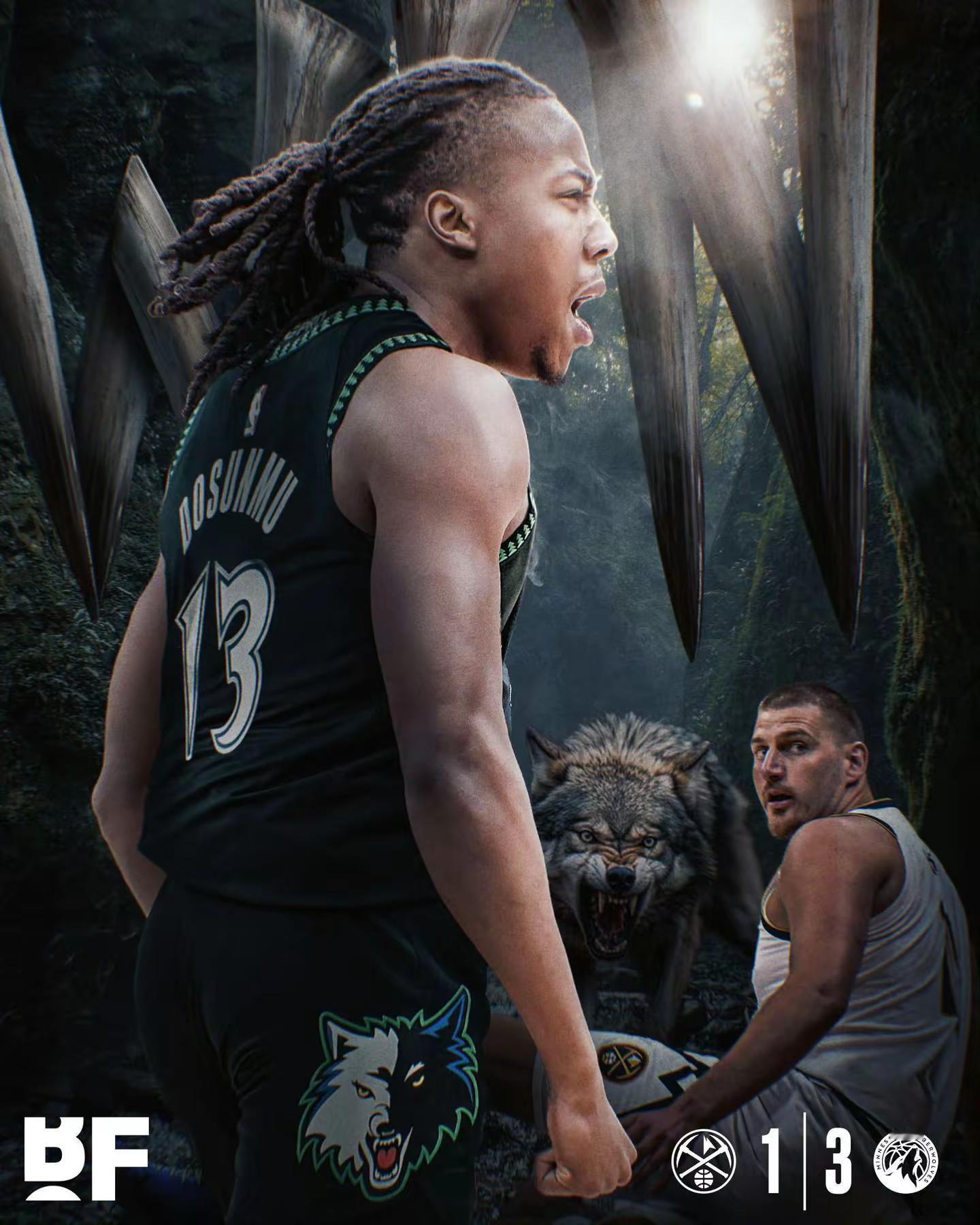 大比分来到3:1!本场比赛真是一个词形容:壮烈!迪文华子接连受伤离场,本以为约基奇会带领丹佛踏平明尼苏达,可是狼群的规矩是!倒下一个狼王,会有新的狼王带领,多森姆迎来了属于自己的夜晚,和戈贝尔强强联手,挡拆,三分,不断的造杀伤,硬生生把比分拉回来,多森姆也迎来了生涯新高43分!莫愁前路无知己,天下谁人不识君!