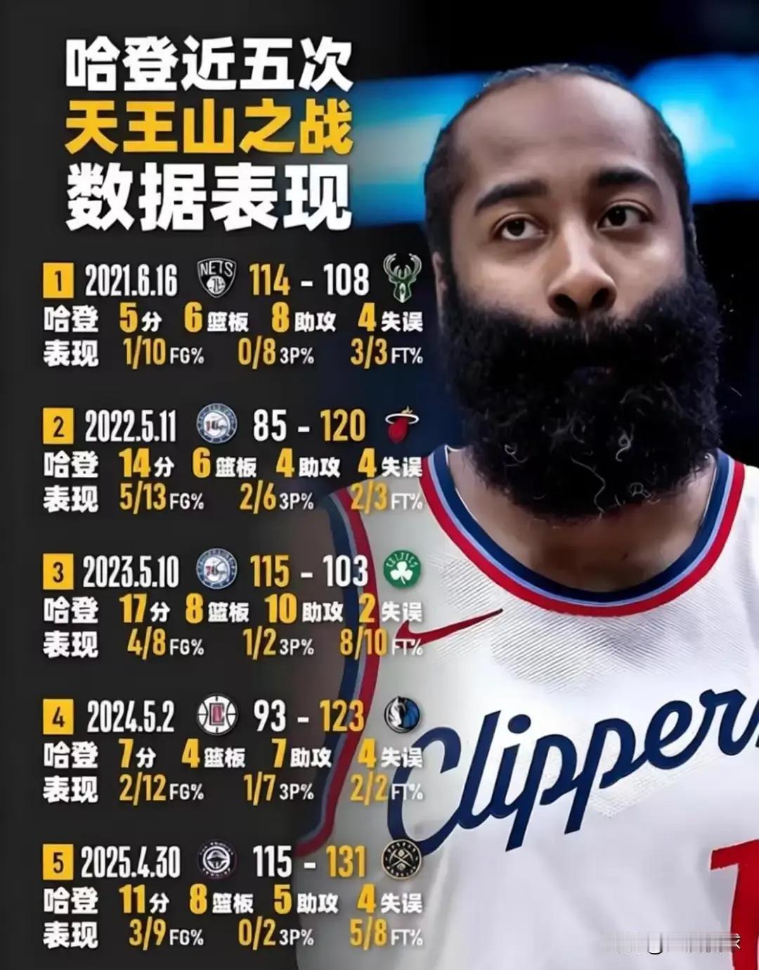 过去十年,哈登在天王山、抢七战经常打出低效率。